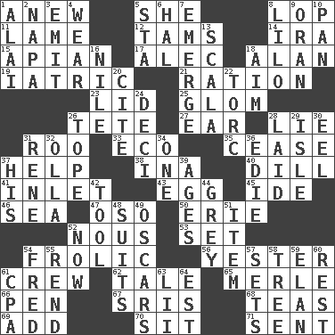 ACROSS 1. Afresh 5. A female animal or person 8. Trim (branches) 11. Unable to walk 12. Scottish caps 14. Lyricist Gershwin 15. Bee-related 17. Actor Baldwin 18. Actor Alda or Thicke 19. Of or pertaining to medicine 21. Food allowance for one day 23. Hat (slang) 25. Take by theft 26. False hair 27. Hearing organ 28. Falsehood 31. Friend of Pooh 33. Environmental prefix 35. Desist 37. Assist 38. _ tizzy (2 wds.) 40. Deli pickle 41. An arm off of a larger body of water 43. Oval reproductive body of a fowl 45. Binary compound 46. Ocean 47. Bear (Spanish) 50. 4th largest of the Great Lakes 52. Common sense 53. Arrange properly for use 54. Romp 56. Last past 61. Ship's personnel 62. Lie 65. Haggard of country music 66. Fenced enclosure 67. Indian titles of respect 68. Beverages made from leaves 69. Increase 70. Be seated 71. Emitted DOWN 1. Jai _ 2. California wine valley 3. Give off 4. Put on (as clothing) 5. R.R. building 6. Actor Linden 7. Develop 8. _ and Stitch 9. Northwest Algerian city 10. Baking dish 13. Any of the three canals of the cochlea 16. "Death on the ____" 18. Direct toward a target or goal 20. Quote 22. Torque (variant) 24. Tenth: prefix 26. Drink excessively 28. Put down 29. Capri or Wight 30. Snakelike fish 31. French philosopher Descartes 32. Water jar 34. Single 36. Singer Brickell 37. Part of HMS, perhaps 39. Eras 42. Instrument 44. Jennifer or Joel 48. Sets of matching outer garments 49. Motion picture awards 51. A whole individual unit 52. At this time 54. Flintstone 55. Tear apart 57. Arranges properly for use 58. Family _ (genealogy) 59. Liveliness 60. Repose 61. Numbers guy (abbr.) 63. Cards in a Roman deck? 64. Eastern Standard Time (abbr.)