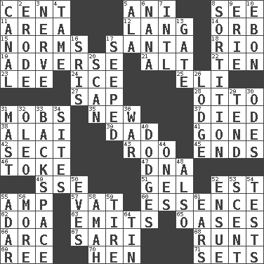ACROSS 1. Penny 5. Black tropical American cuckoo 8. Perceive with the eye 11. Length times width 12. Austrian-born American filmmaker Fritz 14. Globe 15. Typical models 17. Before Barbara or Clara 18. River (Sp.) 19. Contrary to your interests or welfare 21. Keyboard modifier key 22. "___ Little Indians" 23. Area sheltered from the wind 24. Frozen water 25. Connecticut Ivy Leaguer 27. Plant excrement 28. "Beetle Bailey" pooch 31. Disorderly crowds 35. ___ Haven, CT 37. Passed on 38. Jai _ 39. Male parent 41. Went 42. Religious group 43. Friend of Pooh 45. Extremities 46. Casino tip 47. Heredity factor (abbr.) 49. Compass dir. 51. Set 52. Eastern Standard Time (abbr.) 55. Electrical Unit 57. Large container 60. Center 62. ___ good deed 63. Sends forth 65. Fertile tracts in a desert 66. Curve 67. Indian skirt 68. Undersized animal 69. To separate or throw off 70. Layer 71. Puts into a specified state DOWN 1. Lessep's creation 2. Eat (away) 3. Boldness 4. Docile 5. Insect wing 6. Nanny 7. International (abbr.) 8. Decision 9. 4th largest of the Great Lakes 10. Inky black, to poets 13. Yard entry 16. Indian titles of respect 17. Oozed 20. Examine minutely or intensely 26. Inn 29. Watch over 30. Lyric poems 31. Vertical spar for supporting sails 32. Margarine 33. Keyboard key 34. Locates 36. Armed conflict 40. Evades 44. Washington bills 48. In addition 50. Nights before holidays 52. Follow as a consequence or result 53. Aroma 54. Trials 55. The sixth month of the Jewish calendar 56. Greater amount 58. Housemaid 59. Hoop that covers a wheel 61. Hearing organs 64. Metal container