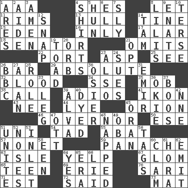 ACROSS 1. Auto club (abbr.) 4. "______ My Girl" (Turtles hit) 8. Allow 11. Basketball hoops 13. Frame or body of a ship 14. Prong on a fork 15. Paradise 16. Inwardly 17. Having or resembling wings 18. Elected representative 21. Leaves out 22. Sweet dark-red dessert wine 23. Cleo's killer 25. Observe 26. Soap unit 29. Utter; complete 32. Vital fluid 34. Compass dir. 35. Disorderly crowd 38. Give a ring to 39. Goodbye (Sp.) 41. Picture 43. Born 44. Sodium hydroxide 45. Greek mythologigal hunter 46. State head 50. Compass dir. 51. Corn or form start 54. Bit 55. Blind as ____ 57. Music written for nine 59. Flamboyance 63. Capri or Wight 64. Sharp bark 67. Take by theft 68. Adolescent 69. One of the Great Lakes 70. Indian skirt 71. Eastern Standard Time (abbr.) 72. Stated 73. Floor protector DOWN 1. Ancient Greek god of war 2. Assistant 3. So be it 4. Upper-body garments 5. Attila the _ 6. Pipe bend 7. Insidious 8. Ms. Damita and namesakes 9. Related on the mother's side 10. Laconic 12. Fastener 14. Scottish cap 19. Frog relative 20. Globe 21. Choose 23. In addition 24. Takes to court 26. English channel? 27. ____ Jay Lerner 28. Hero or heavy, e.g. 30. Flexible twig of a willow tree 31. Independent ruler or chieftain 33. Cassini of fashion 36. Migrant worker of the '30s 37. Scornful sounds 39. Inventor's middle name 40. Colored 42. Compass dir. 45. Northwest Algerian city 47. Baseball player Mel 48. Slept 49. Chief or king in Benin or Nigeria 51. Join together 52. Olfactory organs 53. An arm off of a larger body of water 56. Labels 58. Car or cant ending 60. Dollar (slang) 61. Israeli folk dance 62. Give off 64. Affirmative reply 65. Period 66. Cards in a Roman deck?