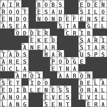 ACROSS 1. Wind 4. Moves up and down 8. Paradise 12. Carrot, for example 14. Son of Isaac 15. Grain storage tower 16. Inside; within (prefix) 17. Unrelated to defense, as in spending 20. Toward the sea 21. R.R. building 22. Set 23. More peculiar 27. Baby bed with high sides 29. Supplemented with great effort 31. Indian skirt 34. Approach 35. Play the lead 36. Bits 39. Spoil 41. United States Postal Service (abbr.) 42. Ancient Greek god of war 43. Porridge 46. Southern CA. univ. 47. Inactive volcano in Sicily 48. Mine, in Marseilles 51. Composer Copland 54. Arrange properly for use 56. Wedding promise 58. Actor Lugosi 61. The property of being fit to eat 66. Relating to the mouth 67. Small Philippine buffalo 68. Nights before holidays 69. Morally bad or wrong 70. Long (Scottish) 71. Transmitted 72. Epoch DOWN 1. Type of rug 2. Charged atoms 3. Cowboy competition 4. Benjamin's nick name 5. Bear (Spanish) 6. Prohibit 7. Soap bubbles 8. Compass dir. 9. Empty-headed or silly people 10. Otherwise 11. Christmas carol 13. Frog relative 18. And so on (abbr.) 19. At a great distance 24. Lair 25. Supplement with great effort 26. 480, 500 or 516 sheets of paper 28. Come out of 30. Window treatment 32. Reproach for some lapse or misdeed 33. Big collection agency 34. Indian state 36. The 19th letter of the Greek alphabet 37. Curve 38. Accusation by an informer 40. Round or rotation of duties 44. Heredity factor (abbr.) 45. Slender fish 49. Lubricate 50. Binary compound 52. Mitch Miller's instrument 53. Effrontery 54. Lick closed 55. Pulitzer Prize-winning author Ferber 57. Washington bills 59. Den 60. Silent film actress Nazimova 62. Container for groceries 63. First lady 64. Elected rep. 65. Fast jet (abbr.)