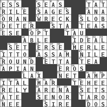 ACROSS 1. Double-curved letter 4. Oceans 8. Make lace 11. Cause heat under the collar 13. Gurus 15. Santa ___, CA 16. NW Algerian seaport 17. Raze 18. Messy guy 19. Prevent from occurring 21. R.R. building 22. Beverages made from leaves 23. Compass dir. 24. Elect 27. The 19th letter of the Greek alphabet 29. Competent 30. Perfect 34. Put into a specified state 36. Celtic language 39. Haggard of country music 40. "Tell ____ the Marines!" 41. Indian state 43. Mediterranean tributary 44. Unit of ammunition 46. Singer James 47. Afternoon social gathering 48. Bee-related 49. Greek god of love 51. Not strict 53. Fish or hair follower 54. Electrical Unit 57. Slanted text style (abbr.) 60. Spoil 63. Giggle 65. Trust 66. Sports stadium 69. Puts into a specified state 70. Had dinner 71. Sir (Sp.) 72. Edible starchy tuberous root 73. Born 74. Title for a man of rank and authority 75. Two (Sp.) DOWN 1. Eat (away) 2. Titles for men of rank and authority 3. Chalkboard 4. Compass dir. 5. Ewer handle 6. Eras 7. Religious group 8. Falsehood 9. Small Philippine buffalo 10. Bar bills 12. Compass dir. 14. Three-handed card game 18. SAT takers 20. Director Reiner 25. Entreaty 26. Laconic 28. Direct toward a target or goal 29. Lacking a tonal center or key 31. One of the Great Lakes 32. Silent film actress Nazimova 33. Area sheltered from the wind 34. Obstruct or block passage 35. Needle case 37. Fast jet (abbr.) 38. Eroded 40. Lyricist Gershwin 42. Female horse 45. Heredity factor (abbr.) 50. Baseball player Mel 52. Dec. holiday 54. Toward the future 55. Paris' subway 56. Mexican monetary units 57. SW Asia republic 58. Wig 59. Toward shelter 61. Ancient Greek god of war 62. Painter Guido (1575-1642) 64. Eastern Standard Time (abbr.) 67. Not either 68. "We ___ not amused" (Victoria)