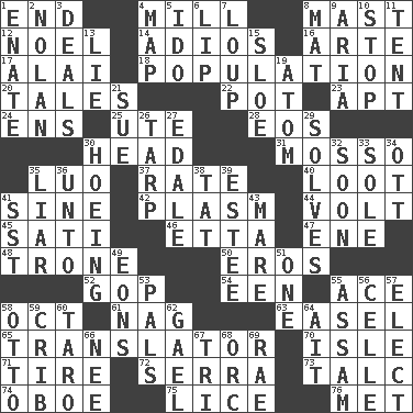 ACROSS 1. Conclude 4. Place where flour is made 8. Vertical spar for supporting sails 12. Christmas carol 14. Goodbye (Sp.) 16. Johnson of "Laugh-In" 17. Mountain range southwest of Kyrgyzstan 18. Census information 20. Falsehoods 22. Cooking vessel 23. Fitting 24. Followers of ems 25. Shoshoni 28. Greek goddess of the dawn 30. Froth on beer 31. With motion or animation 35. Nilotic language 37. Pace 40. Plunder 41. Trig term 42. Suffix with ecto or cyto 44. Electrical Unit 45. Suttee (variant) 46. Singer James 47. Compass dir. 48. Marketplace scale 50. Greek god of love 52. Republican Party 54. Car or cant ending 55. Adept person 58. Sep. follower 61. Tired old horse 63. Artist's stand 65. Interpreter 70. Capri or Wight 71. Hoop that covers a wheel 72. Father Junipero _ 73. Baby powder 74. Mitch Miller's instrument 75. Louse (plural) 76. Was introduced to DOWN 1. Related on the mother's side 2. Pitcher Ryan 3. Allots cards 4. Atlas unit 5. Wedding promise 6. Mouth edge 7. Central Nebraska county 8. Floor protector 9. Roberta Peters solo 10. Obstruct or block passage 11. Portable shelter 13. Falsehood 15. A type of plum 19. Smallest unit of an element 21. Institute legal proceedings 26. Canvas cover 27. Peak District village in England 29. Finds the solution 30. Cultivating 32. Within a short period 33. Not divided or shared with others 34. Baseball player Mel 35. One who doesn't tell the truth 36. To (old English) 38. Make lace 39. First name in cosmetics 41. Fast jet (abbr.) 43. Female horse 49. Immeasurably long periods of time 51. Single 53. Friends 55. Indian state 56. Cell (Danish) 57. Choose 58. "Beetle Bailey" pooch 59. Baby bed with high sides 60. Pacific island yam 62. Highlander 64. Small island 66. Born 67. Three (prefix) 68. The grampus (Milton) 69. Actress Charlotte