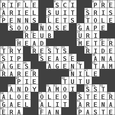 ACROSS 1. Ransack; plunder; pillage 6. _-fi 9. Before (prefix) 12. Satellite of Uranus 13. Set of matching outer garments 14. Indian titles of respect 15. Actor Sean's family 16. Allows 17. Lacquered or enameled metalware 18. "Barney Miller" actor Jack 19. Sense of smell 20. Stare wonderingly 21. Reuben's nickname 23. RI univ. 24. Froth on beer 25. Distance measurement 28. Attempt to accomplish something 30. Musical pauses 34. Travel on an animal 35. Small drink 36. Gospel singer Marvin 38. Santa ___, CA 39. Ripens 41. Representative 43. Scottish cap 44. More valued for its uncommonness 46. Mediterranean tributary 48. Sliced dessert 49. Ballerina skirt 50. Actor Griffith 51. Mine, in Marseilles 53. Fast jet (abbr.) 56. Medicinal plant 57. Butter sub 58. Navigate 60. Highlander 61. Came down and settled, as after flight 62. Sports stadium 63. Epoch 64. Air blower 65. Thick mixture DOWN 1. Strike 2. Angers 3. A pale, very dry sherry 4. Poe poem 5. Raised railways 6. Institutes legal proceedings 7. Quote 8. It is 9. Conciliate 10. Cause heat under the collar 11. Compass dir. 13. Oscar Madison type 14. A viewer who gazes fixedly 19. Unadorned figures 20. Chewing product 22. Hearing organ 24. Abnormally rapid or deep breathing 26. Pulitzer Prize-winning author Ferber 27. 480, 500 or 516 sheets of paper 28. Russian ruler of old 29. Port city in Latvia 31. Ocean 32. Label 33. Compass dir. 37. World-weariness 40. Beer mug 42. Teat (slang) 45. Marina Del _, California 47. A period of five years 49. A blast of a horn 50. Having or resembling wings 51. Silent film actress Nazimova 52. Chow _ 54. Observes 55. Portable shelter 56. Grow older 57. Clumsy lout 58. Plant excrement 59. Actress Charlotte