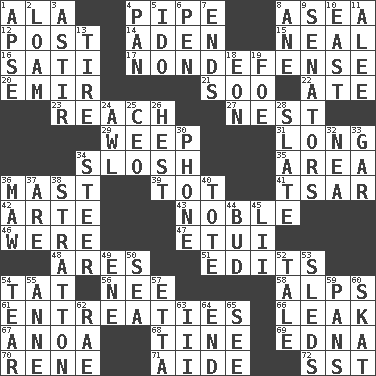 ACROSS 1. Wing 4. Corncob 8. At sea 12. Mail 14. Arabian gulf 15. Anneal 16. Suttee (variant) 17. Unrelated to defense, as in spending 20. Independent ruler or chieftain 21. "Barney Miller" actor Jack 22. Had dinner 23. Arrive at 27. Egg locale 29. Shed a tear 31. Protracted 34. Agitate, as a liquid 35. Type of rug 36. Vertical spar for supporting sails 39. Small child 41. Russian ruler of old 42. Johnson of "Laugh-In" 43. Having high moral qualities 46. We are 47. Needle case 48. Ancient Greek god of war 51. Prepares for publication 54. Make lace 56. Born 58. High mountains 61. Pleas 66. Path through which fluid escapes 67. Small Philippine buffalo 68. Prong on a fork 69. Pulitzer Prize-winning author Ferber 70. French philosopher Descartes 71. Assistant 72. Fast jet (abbr.) DOWN 1. Domed church section 2. Rich soil 3. Moving or stirring 4. Baking dish 5. Wedding promise 6. Animal enclosure 7. Conclusions 8. A saturated hydrocarbon 9. Elected representatives 10. Compass direction 11. Toward shelter 13. Hoop that covers a wheel 18. A really long time 19. Enemy 24. Leather borer 25. Corporate head (abbr.) 26. Command 28. Chalkboard 30. Give a jingle 32. Teachers' org. 33. Slender fish 34. Navigate 36. Opening into something insatiable 37. "We ___ not amused" (Victoria) 38. Ski resort town in Vermont 40. Carryall 44. Partially opened flower 45. Cards in a Roman deck? 49. Compass dir. 50. Ocean 52. Story 53. Bobsleighs 54. Separate forcefully 55. Singer Murray 57. Singer James 59. Baking dishes 60. Three-handed card game 62. Actress Charlotte 63. One more than two 64. Conclusion 65. Observe