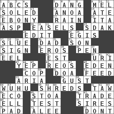 ACROSS 1. Lettered men learn these first 5. Mild oath, euphamism for damn 9. Cartoonist voice _ Blanc 12. Having a sole or soles 14. Small Philippine buffalo 15. Had dinner 16. Dark wood 17. Water falling in drops from the sky 18. Call ___ day 19. Cleo's killer 20. Artist's stands 23. Neighbor of Neb. 24. Prepare for publication 25. Armor plate that protects the chest 27. Change direction abruptly 30. Male parent 32. Male offspring 33. Signal 34. Greek god of love 36. Animal enclosure 38. Snakelike fish 39. Eastern Standard Time (abbr.) 40. RI univ. 43. Slangy assent 46. Vintage cars 48. Paradise 49. Police officer (slang) 51. ___ good deed 52. Nourish 53. Roberta Peters solo 54. Abrupt rush of wind 56. Chinese city south-southwest of Nanjing 58. Tears up 61. The 23rd letter of the Hebrew alphabet 64. Environmental prefix 65. Portico 66. Exchange 68. Pipe bend 69. Trial 70. Fathers 71. Groovy apt. 72. Toward shelter 73. Do not DOWN 1. Toward the sea 2. Moves up and down 3. Hoof sound 4. Elected rep. 5. Have the gumption 6. Of or related to the anus 7. Annoying sounds 8. Separate the seeds from cotton 9. Unmarried girls 10. Singer James 11. Path through which fluid escapes 13. Colored 21. Assistant 22. A viewer who gazes fixedly 23. Trig term 24. Car or cant ending 26. Grand Old Party 27. Compass dir. 28. Falsehood 29. Repulsive 31. Administered medicine 35. Moe Howard, for one 37. Naked 41. To sift 42. Working for oneself (abbr.) 44. Shade of tan 45. Luau course 47. Saudi Arabian king (1953-1964) 48. Lizard (obsolete) 50. Soft color 53. Hold, grip (Informal) 55. Fast planes 56. Shed a tear 57. Southern CA. univ. 59. Flexible conduit 60. Pace 61. Pacific island yam 62. Arabian gulf 63. 270 degrees 65. R.R. building 67. To free from
