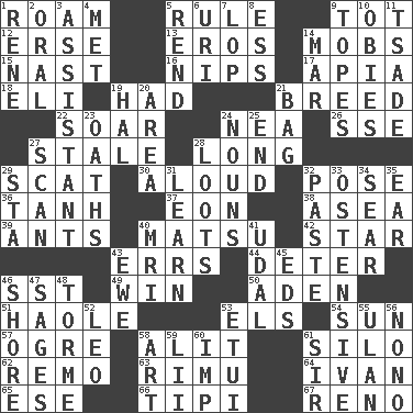 ACROSS 1. Wander 5. General guideline 9. Small child 12. Celtic language 13. Greek god of love 14. Disorderly crowds 15. Political cartoonist Thomas 16. Pinches, bites 17. Capital of Western Samoa 18. Connecticut Ivy Leaguer 19. Possessed 21. A special lineage 22. Fly high 24. Teachers' org. 26. Compass dir. 27. Having lost freshness 28. Yearn 29. Get outta here! 30. Verbally 32. Introduce or present, as a question 36. Hyperbolic tangent 37. A really long time 38. At sea 39. Pismires 40. Taiwanese island in East China Sea 42. Play the lead 43. Blunders 44. Prevent from occurring 46. Fast jet (abbr.) 49. Victory 50. An important port of Yemen 51. White Person, in Hawaii 53. Raised railways 54. Player for Phoenix 57. Legendary monster 58. Set down 61. Grain storage tower 62. San ____ (Riviera town) 63. Tall New Zealand timber tree 64. "Terrible" tsar 65. Compass dir. 66. Native american tent (variation) 67. Western Nevada city DOWN 1. French philosopher Descartes 2. Relating to the mouth 3. Helper 4. Was introduced to 5. Tear apart 6. RI univ. 7. Chop off 8. Curvy letter 9. Drinks excessively 10. Off-Broadway awards 11. Sadhe (variant) 14. Make imperfect 19. Actor Linden 20. Length times width 21. Container for groceries 23. Expletives 24. Parts of speech 25. Conclude 27. Skim 28. Plunders 29. R.R. building 31. Acquire or gain knowledge or skills 32. Thick mixture 33. Clearly or manifestly demonstrative 34. Shrivel 35. Hearing organ 40. Medical imaging device (abbr.) 41. Allodial 43. She-sheep 45. Begley and Asner 46. Dinah or Pauly 47. Gurus 48. Singer Mel 52. Lion 53. Needle holder 55. ____ Bator, Mongolia 56. Words to Nanette 58. Tate display 59. Cards in a Roman deck? 60. Naughty child 61. Title for a knight