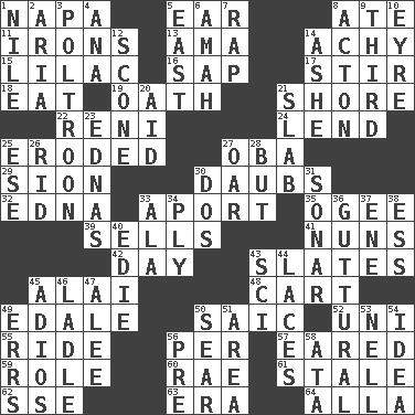 ACROSS 1. California wine valley 5. Ewer handle 8. Had dinner 11. Metal shackles 13. Nursemaid (var.) 14. Painful 15. Pale purple color 16. Plant excrement 17. Move through with a circular motion 18. Ingest 19. Pledge 21. Dinah or Pauly 22. Painter Guido (1575-1642) 24. Grant temporary use of 25. Eaten away 27. Chief or king in Benin or Nigeria 29. The Jewish people; Israel 30. Applies to a surface 32. Pulitzer Prize-winning author Ferber 33. To the left, to Queeg 35. Double curve, resembling the letter S 39. Makes a sale 41. Religious women 42. 24 hours 43. Chalkboards 45. Jai _ 48. Haul 49. Peak District village in England 50. Ketch in the Levant 52. University (slang) 55. Travel on an animal 56. For each 57. Having ears or earlike features 59. Hero or heavy, e.g. 60. Actress Charlotte 61. Lacking originality or spontaneity 62. Compass dir. 63. Epoch 64. Silent film actress Nazimova DOWN 1. "Death on the ____" 2. Roberta Peters solo 3. Characterized by complete cowardliness 4. Santa ___, CA 5. Compass direction 6. Wet nurse 7. Strike 8. NE Massachussets city 9. One of three equal parts 10. Jane of fiction 12. Biscuitlike quick bread 14. American tennis player Robert 20. Assist 21. Broad, flat, thick piece 23. Ferber et al. 25. Compass dir. 26. To free from 27. Boat paddle 28. With the exception that 30. Two (Sp.) 31. Echolocation 33. Chicken ___ king 34. Travel a route regularly 36. From the throat 37. Compass dir. 38. Double-curved letter 40. Singer Brickell 43. _-fi 44. Shoestrings 45. Goodbye (Sp.) 46. Dipping utensil 47. Toward shelter 49. Blunders 50. Singe 51. Type of rug 53. 1994 drama film starring Jodie Foster 54. The content of cognition 56. Before (prefix) 58. "One Day ___ Time"