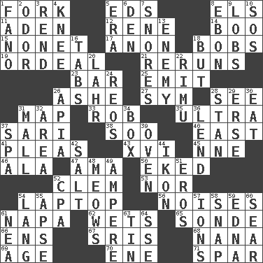 ACROSS 1. Tined utensil 5. Begley and Asner 8. Raised railways 11. An important port of Yemen 12. French philosopher Descartes 14. Oct. 31 cry 15. Music written for nine 17. Soon (poet.) 18. Moves up and down 19. Severe or trying experience 21. Summer TV shows 23. Tavern 25. Give off 26. American tennis player Robert 27. Symbol (abbr.) 28. Perceive with the eye 31. Atlas unit 33. Director Reiner 35. Extremist 37. Indian skirt 38. "Barney Miller" actor Jack 40. Compass direction 41. Entreaties 43. 16 45. Compass dir. 46. Chicken ___ king 47. Housemaid (var.) 50. Made supply last 52. Clement's nick name 53. And not 54. Portable computer 56. Annoying sounds 61. California wine valley 62. Moistens 65. Message 66. Followers of ems 67. Indian titles of respect 68. Grandmother 69. Ripen 70. Compass dir. 71. Practice fight DOWN 1. Papal veil 2. Aroma 3. Tear apart 4. Leg joint 5. Period 6. Lair 7. Sounds asleep 8. Inky black, to poets 9. Tennis shots 10. Mayday 13. Foe 16. Bar bills 18. With the exception that 20. Cowardly lion portrayer 22. Tall New Zealand timber tree 24. Vintage cars 26. Capital of Western Samoa 28. Comedian Laurel of Laurel & Hardy 29. Celtic language 30. Ingest 31. Promenade 32. Type of rug 34. Gift holder 36. Grant temporary use of 37. Health resort 39. Baking chamber 42. Table seasoning 44. Picture 48. Catcalls? 49. Electrical Unit 51. Greek god of love 52. Numbers guy (abbr.) 54. Austrian-born American filmmaker Fritz 55. Domed church section 57. Charged particles 58. Fastener 59. Pulitzer Prize-winning author Ferber 60. Scorch 61. Teachers' org. 63. Shallow baking pan 64. Compass dir.