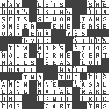 ACROSS 1. Opening into something insatiable 4. Allows 8. A female animal or person 11. Mouths or openings 13. Supplementing with great effort 15. Afternoon social gathering 16. Puts into a specified state 17. Sir (Sp.) 18. Scottish caps 19. Scornful expression 21. She-sheep 22. Celtic language 23. Rowing implement 24. Period 27. Consenting reply 29. Colored 30. Constricts 34. Pull behind 36. Pinches, bites 39. Grain storage towers 40. Undercover agent 41. Singer Mel 43. Foregone conclusion 44. Shopping centers 46. Oceans 47. Car dealer's back yard 48. Peak District village in England 49. Assign a rank or rating to 51. _ tizzy (2 wds.) 53. Third day of the wk. 54. Raised railways 57. At once, immediately (arch.) 60. Compass dir. 63. Rhinal 65. Austrian-born American filmmaker Fritz 66. Relating to or accompanying birth 69. Immoral or dissolute person 70. Single 71. Bert's buddy 72. Made supply last 73. Greek goddess of the dawn 74. Haul 75. Big collection agency DOWN 1. With motion or animation 2. Sports stadium 3. Wetness 4. French article 5. Supplement with great effort 6. Prong on a fork 7. Frozen precipitation 8. Play the lead 9. Is hesitant and indecisive 10. Relaxation 12. Compass dir. 14. Jennifer or Joel 18. A testis 20. Marina Del _, California 25. Monthly bill 26. Goodbye (Sp.) 28. Double-curved letter 29. Home 31. Butter sub 32. Left side of a ship or aircraft 33. Fast jet (abbr.) 34. Frog relative 35. Spanish pot 37. Before (prefix) 38. Don Adams' spy role 40. Madame (abbr.) 42. Son of Isaac 45. Elected rep. 50. Nine, plus one 52. Singer Murray 54. 1973 Nobel Price Winner (Physics) Leo 55. Member of a famous L.A. basketball team 56. Bobsleighs 57. _ vera 58. Billionth: prefix 59. Washington bills 61. Drug cop 62. Inactive volcano in Sicily 64. "We ___ not amused" (Victoria) 67. Atmosphere 68. Allow