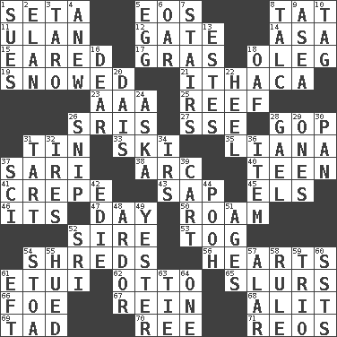 ACROSS 1. Bristle 5. Greek goddess of the dawn 8. Make lace 11. ____ Bator 12. Yard entry 14. White ___ sheet 15. Having ears or earlike features 17. Pate de foie ____ 18. Cassini of fashion 19. Frozen precipiation fell 21. New York city 23. Auto club (abbr.) 25. Coral ridge 26. Indian titles of respect 27. Compass dir. 28. Grand Old Party 31. Shallow baking pan 33. What Jean-Claude Killy likes to do 35. Woody, climbing, usually tropical plant 37. Indian skirt 38. Curve 40. Adolescent 41. Streamer paper 43. Plant excrement 45. Raised railways 46. ___ a Wonderful Life 47. 24 hours 50. Wander 52. Male parent of an animal 53. Coat; cloak 54. Tears up 56. Centers 61. Needle holder 62. "Beetle Bailey" pooch 65. Disparaging remarks 66. Enemy 67. It's straight from the horse's mouth 68. Came down and settled, as after flight 69. Bit 70. To sift 71. Vintage cars DOWN 1. Institutes legal proceedings 2. Enthusiasm 3. Edible starchy tuberous root 4. Afresh 5. Ovum 6. Boat paddle 7. Flight of steps 8. Baby powder 9. At sea 10. Label 13. _____ Park, CO 16. Letter starter 18. Clumsy lout 20. Raised platform 22. The bottom of a shoe or boot 24. "____ silly question..." 26. Clip 28. Highlander 29. Singles 30. Baking dish 31. Small pie 32. Angers 34. Big collection agency 36. A whole individual unit 37. _-fi 39. Draw slowly or heavily 42. Singer Brickell 44. "Silly old bear" 48. Zeal 49. Of or pertaining to yesterday 51. Grows older 52. Indian title of respect (Mr.) 54. Portico 55. Became colored 57. Having or resembling wings 58. General guideline 59. Musical group of three 60. Fast planes 61. Lizard (obsolete) 63. Make a knot 64. Single