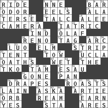 ACROSS 1. Travel on an animal 5. Compass dir. 8. Drinking establishment 11. Scent 12. Snakelike fish 14. According to 15. Laconic 17. Baby powder 18. Toward shelter 19. Device for capturing images 21. Of or pertaining to medicine 23. Working for oneself (abbr.) 25. Norwegian king 26. Western Nevada city 27. Label 28. Curve 31. Nilotic language 33. Shade tree 35. Empty completely 37. Portable shelter 38. Pull behind 40. Southern CA. univ. 41. Expletives 43. Soggy 45. Definite Article 46. Ring climax 47. Scottish cap 50. Son of Isaac 52. Went 53. Baking dish 54. Window treatments 56. Ridicules or criticizes harshly 61. (Had) reclined 62. "____ silly question..." 65. Nick name for Arthur 66. Globe 67. 480, 500 or 516 sheets of paper 68. Merit 69. Affirmative reply 70. R.R. building 71. Ancient Greek god of war DOWN 1. College mil. group 2. The content of cognition 3. Dormintory (informal) 4. Celtic language 5. Fish or hair follower 6. Teachers' org. 7. American author Paul (1891-1958) 8. Indonesian resort city 9. Actor Baldwin 10. Actress Charlotte 13. Any of the three canals of the cochlea 16. 4th largest of the Great Lakes 18. Sandy's bark 20. Singer Murray 22. Labels 24. Stupid person 26. Writer of Portnoy's Complaint (1969) 28. Bowlike part 29. Cause heat under the collar 30. Tax preparer (abbr.) 31. Path through which fluid escapes 32. To (old English) 34. Cut the grass 36. Ballerina skirt 37. Small child 39. Shed a tear 42. Halt 44. Russian ruler of old 48. Approach 49. Makes clutter 51. Small Philippine buffalo 52. Separate the seeds from cotton 54. Have the gumption 55. Teases 57. Length times width 58. Play the lead 59. Hoop that covers a wheel 60. Elected reps. 61. Myrna of the movies 63. Krazy ___ of comics 64. Housemaid (var.)
