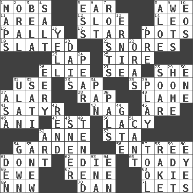 ACROSS 1. Crowds into 5. Hearing organ 8. Deep reverence 11. Type of rug 12. A type of plum 14. Lion 15. Friendly 17. Play the lead 18. Plant holders 19. Scheduled 21. Sounds asleep 23. Pet locale 25. Hoop that covers a wheel 26. Writer Wiesel 27. Ocean 28. A female animal or person 31. Purpose 33. Plant excrement 35. Soup utensil 37. Having or resembling wings 38. Hit sharply and swiftly 40. Unable to walk 41. Letch 43. Tired old horse 45. "We ___ not amused" (Victoria) 46. Black tropical American cuckoo 47. Eastern Standard Time (abbr.) 50. Made of lace 52. Queen of England 1702-14 53. R.R. building 54. Place where plants grow 56. Main course 61. Do not 62. Singer Brickell 65. Sycophant 66. She-sheep 67. French philosopher Descartes 68. Migrant worker of the '30s 69. Compass dir. 70. Daniel's nick name 71. Allows DOWN 1. Atlas contents 2. Taken by mouth 3. Actor Lugosi 4. Table seasoning 5. Double-curved letter 6. The first octave above the treble staff 7. Cooks with dry heat, as in an oven 8. _ vera 9. Soaks 10. Greek goddess of the dawn 13. Bert's buddy 16. Shout 18. Before (prefix) 20. Raised platform 22. Mouths or openings 24. Lightbulb-shaped fruit 26. Suggestive of the supernatural 28. Fly high 29. Residence 30. Compass dir. 31. ____ Bator 32. Suttee (variant) 34. Baking dish 36. Shaw product 37. White ___ sheet 39. Friends 42. Tear apart 44. Yard entry 48. Scornful expression 49. Watched over 51. Patter 52. Tate display 54. Woman's formal wear 55. Afresh 57. Instrument 58. Immoral or dissolute person 59. Prepare for publication 60. Sight organs 61. Lair 63. _ tizzy (2 wds.) 64. Car or cant ending