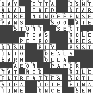 ACROSS 1. 24 hours 4. Singer James 8. Is not 12. Of or related to the anus 14. Supplemented with great effort 15. Letter starter 16. Greater amount 17. Unrelated to defense, as in spending 20. Zero-star reviews 21. "Barney Miller" actor Jack 22. Had dinner 23. Difficult or unusual or dangerous feat 27. Religious group 29. Beverages made from leaves 31. Hero or heavy, e.g. 34. Stone: prefix 35. Ancient Greek god of war 36. Food container 39. Travel a route regularly 41. Inconspicuous attention getter 42. To the inside or interior of 43. Allots cards 46. Merit 47. Water jar 48. Period of immesurable duration 51. Some stationery 54. Make lace 56. Modern: prefix 58. Cause heat under the collar 61. Pleas 66. Earth 67. Portico 68. Haul 69. Inactive volcano in Sicily 70. Prong on a fork 71. Single time 72. Elected rep. DOWN 1. Moist 2. Small Philippine buffalo 3. Tall tales 4. Car or cant ending 5. Ring climax 6. Nine, plus one 7. Sums up 8. Binary compound 9. Legislators 10. Political cartoonist Thomas 11. Family _ (genealogy) 13. For fear that 18. Greek goddess of the dawn 19. Enemy 24. Shoshoni 25. Remaining after all deductions 26. Canvas cover 28. Dice game 30. Twentieth part of a lira 32. French article 33. Eastern Standard Time (abbr.) 34. Give a jingle 36. Pass on 37. _ tizzy (2 wds.) 38. Ski resort town in Vermont 40. Sharp bark 44. Wing 45. Pet locale 49. Single 50. Teachers' org. 52. Celtic language 53. Disturbances 54. Trial 55. Against 57. "Beetle Bailey" pooch 59. Actor's bit 60. Enthusiasm 62. Actress Charlotte 63. Electrically charged atom 64. And so on (abbr.) 65. Perceive with the eye