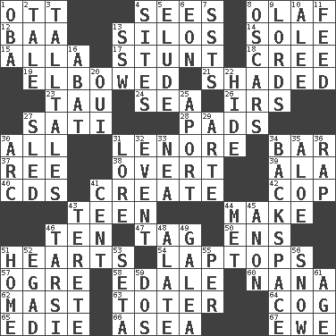 ACROSS 1. Baseball player Mel 4. Observes 8. Norwegian king 12. Sound made by sheep 13. Grain storage towers 14. Flatfish 15. Silent film actress Nazimova 17. Check the growth or development of 18. Algonquian 19. Shoved, as through a crowd 21. Cast a shadow over 23. The 19th letter of the Greek alphabet 24. Ocean 26. Big collection agency 27. Suttee (variant) 28. Groovy apts. 30. 100% 31. Poe poem 34. Tavern 37. To separate or throw off 38. Unconcealed 39. Insect wing 40. Music discs 41. Make 42. Police officer (slang) 43. Adolescent 44. Cause to be 46. "___ Little Indians" 47. Label 50. Followers of ems 51. Centers 54. Portable computers 57. Legendary monster 58. Peak District village in England 60. Nanny 62. Vertical spar for supporting sails 63. Carrier 64. Gear tooth 65. Singer Brickell 66. Toward the sea 67. She-sheep DOWN 1. Chief or king in Benin or Nigeria 2. Story 3. Baron Munchausen's specialties 4. Locates 5. Evade 6. Period of immesurable duration 7. Fast planes 8. Motion picture awards 9. Nobles 10. Toward shelter 11. Nourish 13. Compass dir. 16. Blind as ____ 20. Fr. "Yes" 22. Flintstone garb 25. To the left, to Queeg 27. Downhill vehicle 29. Johnson of "Laugh-In" 30. Curve 31. Old wives' tales, e.g. 32. Incident 33. Teachers' org. 34. Keyboard key 35. _ vera 36. Hit sharply and swiftly 41. Penny 43. Cigar-shaped 44. Was introduced to 45. At once, immediately (arch.) 46. Tarsus (plural) 48. Having winglike extensions 49. An organ shaped like a helmet 51. Dwelling 52. Mild oath 53. Stalk of a moss capsule 55. For each 56. Overwhelm 59. Two (Sp.) 61. Ripen