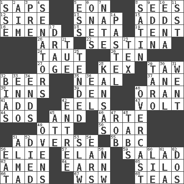ACROSS 1. Plant excrements 5. Period of immesurable duration 8. Observes 12. Title for a man of rank and authority 13. Fastener 15. Sums up 16. Make improvements or corrections to 18. Stalk of a moss capsule 19. Portable shelter 20. Nonscientific branch of learning 22. French poetic form 24. Strained 26. "___ Little Indians" 27. Double curve, resembling the letter S 28. Dry husk or covering 29. The 23rd letter of the Hebrew alphabet 32. Fermented drink made from hops 35. Actress Patricia 37. A saturated hydrocarbon 38. Lodging establishments 39. Lair 40. Northwest Algerian city 41. Increase 42. Snakelike fish 43. Electrical Unit 44. Distress signal 45. Plus 46. Johnson of "Laugh-In" 49. Baseball player Mel 50. Fly high 51. Contrary to your interests or welfare 55. English channel? 56. Writer Wiesel 57. Enthusiasm 59. Vegetable dish 63. So be it 64. Merit 65. Grain storage tower 66. Bits 67. Compass dir. 68. Afternoon social gatherings DOWN 1. Compass dir. 2. Direct toward a target or goal 3. Before (prefix) 4. Elected representatives 5. Double-curved letter 6. Singles 7. Nathan's nickname 8. Smooth fabric 9. Locale of original sin 10. Pulitzer Prize-winning author Ferber 11. Fast jet (abbr.) 14. Soft color 17. To be drawn or hauled along 21. Third day of the wk. 23. John Ritter's dad 25. Looked after 28. Sunflower state 29. Pacific island yam 30. Of or related to the anus 31. Gone 32. Prejudice 33. Inside; within (prefix) 34. Extremities 36. Snakelike fish 40. Cloudy 42. Main course 45. Had dinner 47. Director Reiner 48. Bar bills 49. Baking chambers 51. _ mater 52. Passed on 53. Cole _ (cabbage dish) 54. Hearing organs 56. Ingest 58. Compass dir. 60. Untruth 61. According to 62. Two (Sp.)