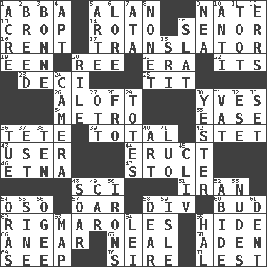 ACROSS 1. Swedish rock group 5. Actor Alda or Thicke 9. Nathan's nickname 13. Riding implement 14. Printing process, for short 15. Sir (Sp.) 16. Monthly bill 17. Interpreter 19. Car or cant ending 20. To riddle 21. Epoch 22. It is 23. Tenth: prefix 25. Teat (slang) 26. At or to great height 30. Jacques Cousteau's middle name 34. Paris' subway 35. Relaxation 36. Wig 39. "_____ Recall" 42. Proofreading order 43. One who uses or employs something 44. Spew [out] 46. Inactive volcano in Sicily 47. Fur scarf 48. _-fi 51. SW Asia republic 54. Bear (Spanish) 57. Rowing implement 58. HTML Container Element 60. Partially opened flower 62. Frustrating wastes of time 65. Flintstone garb 66. Approach 67. Anneal 68. An important port of Yemen 69. Ooze 70. Male parent of an animal 71. For fear that DOWN 1. Measure of real estate 2. A special lineage 3. Maid-servant 4. Fitting 5. Johnson of "Laugh-In" 6. Old wives' tales, e.g. 7. "One Day ___ Time" 8. Music written for nine 9. Teachers' org. 10. Against 11. A blast of a horn 12. Blunders 15. Narrow board 18. _ Lanka 20. Cause heat under the collar 24. Device for capturing images 27. Baseball player Mel 28. Away 29. Hauls 30. Last past 31. Large container 32. Compass dir. 33. Put into a specified state 36. Third day of the wk. 37. Eastern Standard Time (abbr.) 38. "___ Little Indians" 40. Nonscientific branch of learning 41. Nilotic language 45. 154 in Roman numerals 48. Fly high 49. Automobile 50. Metal shackles 52. Tolerate 53. Unadorned figures 54. Mouths or openings 55. Trig term 56. Double curve, resembling the letter S 58. Letter starter 59. Capri or Wight 61. Gouge 63. Atlas unit 64. Luau accessory 65. Actor Linden
