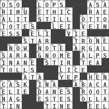 ACROSS 1. Bear (Spanish) 4. Chops off 8. White ___ sheet 11. Tall New Zealand timber tree 13. Principle of right and wrong 15. Actress Charlotte 16. Set down 17. Free of sound 18. Von Bismarck 19. Hauls 21. Luau accessory 22. Distinctive style or manner 23. Double-curved letter 24. Connecticut Ivy Leaguer 27. Compete 29. Play the lead 30. Marketplace scale 34. At this time 36. Brief written record 39. Therefore, facetiously 40. "Two Mules for Sister ____" 41. Dwarf 43. High mountains 44. Lacking in sense or substance 46. Tumult 47. Afternoon social gathering 48. For Whom the Bell _____ 49. Louse (plural) 51. "One Day ___ Time" 53. Slangy assent 54. Layer 57. Keg 60. _ tizzy (2 wds.) 63. Phillipine bananalike plant 65. Writer Wiesel 66. Natives or inhabitants of Denmark 69. Carrot, for example 70. Tired old horse 71. _____ Park, CO 72. Rounded earthenware pot or jar 73. Metal container 74. Prong on a fork 75. Snakelike fish DOWN 1. Declaim 2. Grain storage towers 3. Leaves out 4. French article 5. Baseball player Mel 6. Silvers or Donahue 7. Drop; flow; fall 8. Johnson of "Laugh-In" 9. Suttee (variant) 10. A really long time 12. Shoshoni 14. 154 in Roman numerals 18. Make much ado about nothing 20. Arrange properly for use 25. Long (Scottish) 26. Metal shackles 28. Call ___ day 29. Tchaikovsky ballet 31. Stare 32. California wine valley 33. Raised railways 34. Billionth: prefix 35. Relating to the mouth 37. Small child 38. Poet Dickinson 40. Be seated 42. 4th largest of the Great Lakes 45. Eastern Standard Time (abbr.) 50. Numbers guy (abbr.) 52. Helper 54. White Person, in Hawaii 55. Learning spot: Fr. 56. Relating to or accompanying birth 57. Penny 58. Jai ____ 59. Public display of a written message 61. Political cartoonist Thomas 62. Opposed to 64. Sis' sibling 67. Car or cant ending 68. Compass dir.
