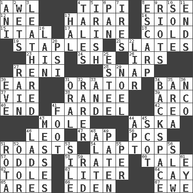 ACROSS 1. Leather borer 4. Native american tent (variation) 8. Celtic language 12. Born 13. Ethiopian city, capital of Harari 14. The Jewish people; Israel 15. Slanted text style (abbr.) 17. Place in a line 18. Having a low temperature 19. Paper fasteners 21. Chalkboards 23. Part of HMS, perhaps 24. A female animal or person 26. Big collection agency 27. Painter Guido (1575-1642) 28. Fastener 30. Hearing organ 31. Speaker 34. Prohibit 37. Compete 38. Indian princess (variant) 39. Curve 40. Conclusion 41. Pack 42. Corporate head (abbr.) 43. Undercover agent 44. "____ silly question..." 46. Lion 47. Strike 50. Personal Computers (abbr.) 51. Exposes to great heat 54. Portable computers 57. Probability 58. Feeling or showing extreme anger 60. Story 62. Lacquered or enameled metalware 63. 61 cubic inches 64. Island 65. Ancient Greek god of war 66. Genesis locale 67. She-sheep DOWN 1. Cuckoo 2. Soaks 3. Resembling or made to resemble leather 4. Lies 5. From or relating to Ireland 6. Baking dish 7. Angers 8. Fortification 9. Debaucheries 10. Flatfish 11. Conclusions 13. Actor Linden 16. (Had) reclined 20. Air pressure measure (abbr.) 22. One who doesn't tell the truth 25. First name in cosmetics 27. Precipitation 29. Christmas carol 30. First lady 31. Taken by mouth 32. Less widely known 33. Plus 34. Keyboard key 35. Length times width 36. Non-commissioned officer (abbr.) 41. Pick up the tab 43. Makes clutter 44. Fitting 45. Native of Scotland 46. Dipping utensil 48. Having winglike extensions 49. Eucharist need 51. Roll call or roster of names 52. Scent 53. Filth; sediment 55. For each 56. Cole _ (cabbage dish) 59. To free from 61. Sight organ