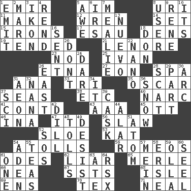 ACROSS 1. Arab leader 5. Direct toward a target or goal 8. RI univ. 11. Cause to be 12. Songbird 14. Arrange properly for use 15. Removes the wrinkles 17. Son of Isaac 18. Cub Scout units 19. Looked after 21. Poe poem 23. Allow head to fall sleepily 25. _ the terrible 26. Inactive volcano in Sicily 27. Period of immesurable duration 28. Health resort 31. Santa ___, CA 33. Three (prefix) 35. Motion picture award 37. Oceans 38. And so on (abbr.) 40. Drug cop 41. Continued (abbr.) 43. American Automobile Association (abbr.) 45. Baseball player Mel 46. _ tizzy (2 wds.) 47. It would 50. Cole _ (cabbage dish) 52. _ gin 53. Krazy ___ of comics 54. Ringlike coral islands and reefs 56. Lover boys 61. Lyric poems 62. One who doesn't tell the truth 65. Haggard of country music 66. Teachers' org. 67. Fast planes 68. Small island 69. Followers of ems 70. John Ritter's dad 71. Actress Patricia DOWN 1. Send forth 2. Female horse 3. Picture 4. Tear apart 5. Deep reverence 6. Big collection agency 7. Ear of corn 8. One who makes use of a thing 9. French philosopher Descartes 10. It is 13. New (sp.) 16. Emitted 18. Spanish title 20. Do not 22. Billionth: prefix 24. Have the gumption 26. 90 degrees 28. Get outta here! 29. Role in a play 30. Curve 31. Period of immesurable duration 32. Nanny 34. Call ___ day 36. Overwhelm 37. _-fi 39. Keg 42. Deli pickle 44. Having or resembling wings 48. For Whom the Bell _____ 49. Stop 51. Smallest unit of an element 52. Mayday 54. An important port of Yemen 55. Afternoon social gatherings 57. Count _ (2 wds.) 58. Celtic language 59. Water jar 60. Stitch closed the eyes of (a falcon) 61. Single 63. Had dinner 64. Acura sports coupe