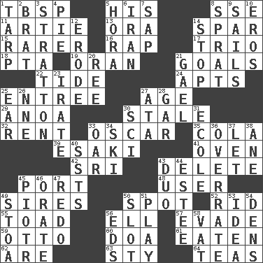 ACROSS 1. Cook's measure (abbr.) 5. Part of HMS, perhaps 8. Compass dir. 11. Nick name for Arthur 13. Mouth or opening 14. Practice fight 15. Less widely known 16. Hit sharply and swiftly 17. Musical group of three 18. Parent Teacher Assoc. 19. NW Algerian seaport 21. Finish lines 22. Event that recurs at intervals 24. Flats, for short 25. Main course 27. Mature 29. Small Philippine buffalo 30. Lacking originality or spontaneity 32. Monthly bill 33. Motion picture award 35. Root beer relative 39. 1973 Nobel Price Winner (Physics) Leo 41. Baking chamber 42. Indian title of respect (Mr.) 43. Erase 45. Sweet dark-red dessert wine 48. One who makes use of a thing 49. Titles for men of rank and authority 50. Specific locale 52. To free from 55. Frog relative 56. Pipe bend 57. Dodge 59. Von Bismarck 60. ___ good deed 61. Consumed 62. "We ___ not amused" (Victoria) 63. Filthy place 64. Afternoon social gatherings DOWN 1. Canvas cover 2. Naughty child 3. Ski resort town in Vermont 4. Sliced dessert 5. Israeli folk dance 6. SW Asia republic 7. Plant excrement 8. Small fatty European fish 9. Moves on water 10. Greek god of love 12. Eat (away) 14. Discontinue 20. To sift 21. Highlander 23. Feeling or showing extreme anger 25. Hearing organ 26. Compass dir. 27. _ moment's notice (2 wds.) 28. Slender fish 30. _-fi 31. Learning spot: Fr. 33. Boat paddle 34. What Jean-Claude Killy likes to do 36. Make much ado about nothing 37. Allow 38. A saturated hydrocarbon 40. Fast planes 43. Superhero pair 44. First name in cosmetics 45. Peter (Polish) 46. Speak pompously 47. Redecorate 49. Portico 50. Slit 51. Romp 53. The content of cognition 54. Lairs 56. Begley and Asner 58. Large container
