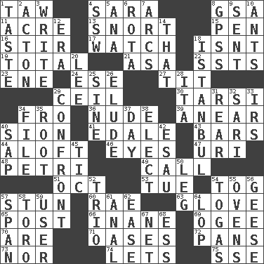 ACROSS 1. The 23rd letter of the Hebrew alphabet 4. "Two Mules for Sister ____" 8. Girls' org. (abbr.) 11. 1/640 square mile 13. Derisive sound 15. Fenced enclosure 16. Use a swizzle stick 17. Timepiece 18. Is not 19. "_____ Recall" 21. White ___ sheet 22. Fast planes 23. Compass dir. 24. Compass dir. 27. Teat (slang) 29. To provide with a ceiling 30. Tarsus (plural) 34. From 36. Unadorned 39. Approach 40. The Jewish people; Israel 41. Peak District village in England 43. Long, evenly shaped pieces 44. Upward 46. Snake ____ (dice throw) 47. RI univ. 48. _ dish (used to culture cells) 49. Give a ring to 51. Sep. follower 53. Third day of the wk. 54. Coat; cloak 57. Astound 60. Actress Charlotte 63. Michael Jackson trademark 65. Mail 66. Silly 69. Double curve, resembling the letter S 70. "We ___ not amused" (Victoria) 71. Fertile tracts in a desert 72. Baking dishes 73. Not either 74. Allows 75. Compass dir. DOWN 1. Clothes sense 2. Gambison 3. Compose 4. Compass dir. 5. Santa ___, CA 6. Roll call or roster of names 7. Curves 8. Global Positioning Systems (abbr.) 9. Posted 10. Pismires 12. Epoch 14. Not this but _ 18. Byzantium, centuries later 20. Area sheltered from the wind 25. Trig term 26. Evade 28. Call ___ day 29. Meet 31. Tail end 32. Indian skirt 33. Big collection agency 34. Do some clerical work 35. Carrot, for example 37. 24 hours 38. Opt 40. Plant excrement 42. He sold his birthright 45. Nervous spasm 50. Part of a journey 52. Musical group of three 54. Ancient Roman robes 55. Baking chambers 56. Honkers 57. Connect, as a bridge 58. "Corrida" creature 59. One who makes use of a thing 61. Of or related to the anus 62. Relaxation 64. Chop off 67. Fish or hair follower 68. Curvy letter