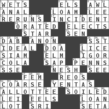 ACROSS 1. Moistens 5. Raised railways 8. Leather borer 11. Of or related to the anus 12. Rich soil 13. Area sheltered from the wind 14. Summer TV shows 17. Happening 19. Spoke pompously 21. Opts 22. Play the lead 23. Elected rep. 24. Apply (a substance) by light strokes 27. At once, immediately (arch.) 29. Fast jet (abbr.) 32. Perfect 34. ___ good deed 36. Louse (plural) 37. Thailand, formerly 38. Shade tree 39. Russian composer Stravinsky 40. Root beer relative 41. Plant excrement 42. Actor Sean's family 43. Compass dir. 44. Tender 46. Observe 47. Opposite of masc. 50. Vintage cars 52. Rough 55. Gossips 57. One to whom something is allotted 59. Dirtied 62. Flowery wreath 63. Snakelike fish 64. Grant temporary use of 65. Car dealer's back yard 66. Indian title of respect (Mr.) 67. Bristle DOWN 1. Armed conflict 2. Compass dir. 3. Edible starchy tuberous root 4. Plays smoothly or legato 5. A really long time 6. Shoestrings 7. Grin 8. Actor Baldwin 9. Left 10. Allows 12. Flaplike covering 15. Relating to or accompanying birth 16. Comedian Laurel of Laurel & Hardy 18. Lair 20. Eats (away) 24. Plates 25. Goodbye (Sp.) 26. Calif. Air Force Base 28. Pitcher Ryan 29. Attaches a signature 30. Biscuitlike quick bread 31. Laconic 33. Housemaid (var.) 35. Electrical Unit 36. Falsehood 42. Picture 45. Elected reps. 47. From 48. _____ Park, CO 49. Distance measurement 51. Moves on water 52. Give a ring to 53. Butter sub 54. Set down 55. Consenting reply 56. _ gin 58. Biblical high priest 60. Consume 61. Heredity factor (abbr.)