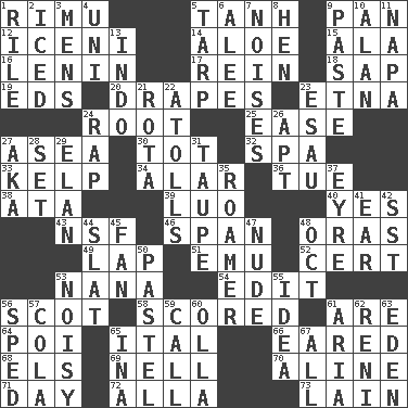 ACROSS 1. Tall New Zealand timber tree 5. Hyperbolic tangent 9. Baking dish 12. Ancient Celtic tribe of eastern Britain 14. _ vera 15. According to 16. Soviet premier 1918-24 17. It's straight from the horse's mouth 18. Plant excrement 19. Begley and Asner 20. Window treatments 23. Inactive volcano in Sicily 24. Carrot, for example 25. Relaxation 27. Toward the sea 30. Small child 32. Health resort 33. Seaweed 34. Having or resembling wings 36. Third day of the wk. 38. _ moment's notice (2 wds.) 39. Nilotic language 40. It is so 43. Overdraft (abbr.) 46. Connect, as a bridge 48. Mouths or openings 49. Infant locale 51. Australian flightless bird 52. An absolute certainty 53. Nanny 54. Prepare for publication 56. Native of Scotland 58. Tallied 61. "We ___ not amused" (Victoria) 64. Luau course 65. Slanted text style (abbr.) 66. Having ears or earlike features 68. Raised railways 69. 1994 drama film starring Jodie Foster 70. Place in a line 71. 24 hours 72. Silent film actress Nazimova 73. (Had) reclined DOWN 1. Cause heat under the collar 2. On the rocks 3. Not women's 4. University (slang) 5. Canvas cover 6. Toward shelter 7. Annoying sounds 8. Layer 9. Thick mixture 10. ____ Jay Lerner 11. California wine valley 13. Southeast Asian peninsula 21. Roll call or roster of names 22. Ringlike coral islands and reefs 23. Son of Isaac 24. Hit sharply and swiftly 26. Fitting 27. Alias (abbr.) 28. Put into a specified state 29. Enthusiasm 31. Grayish beige 35. Nomad 37. Jane of fiction 41. Hearing organ 42. Fast jet (abbr.) 44. Narrow board 45. Avid follower 47. Naked 48. Sep. follower 50. Soft color 53. Annoyingly loud 55. The main thing one is thinking about 56. Broke a traffic law 57. Root beer relative 59. Give a ring to 60. Water jar 61. Roberta Peters solo 62. Painter Guido (1575-1642) 63. Paradise 65. _ tizzy (2 wds.) 67. 100%