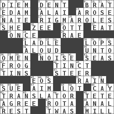 ACROSS 1. South Vietnam president (1954) 5. Gouge 9. Naughty child 13. Dutch treat 14. Jai ____ 15. Came up 16. Nathan's nickname 17. Complicated, petty procedures 19. A female animal or person 20. Last letter of the English alphabet 21. Baseball player Mel 22. Erode 23. Single time 25. Actress Charlotte 26. Dipping utensil 30. Chops off 34. Verbally 35. To (old English) 36. Sign of things to come 39. Annoying sound 42. Oceans 43. Toadlike animal 44. Colored lightly or faintly 46. Canisters 47. Bull 48. Greek goddess of the dawn 51. Precipitation 54. Institute legal proceedings 57. Direct toward a target or goal 58. Car dealer's back yard 60. Island 62. Interpreter 65. Wig 66. Match 67. Round or rotation of duties 68. Of or related to the anus 69. Relief 70. It was, poetically 71. Place where flour is made DOWN 1. Hiding places for outlaws 2. Potato state 3. Consumed 4. Madame (abbr.) 5. Have the gumption 6. Writer Wiesel 7. Tired old horse 8. Southeast Indonesia island 9. Sis' sibling 10. Hero or heavy, e.g. 11. At sea 12. Trial 15. Johnson of "Laugh-In" 18. "One Day ___ Time" 20. Ardor 24. Rigngs loudly 27. Spanish title 28. Nilotic language 29. Prepares for publication 30. A period of five years 31. Single 32. Parent Teacher Association (abbr.) 33. Distress signal 36. Often (poetically) 37. Medical imaging device (abbr.) 38. A really long time 40. Be seated 41. Compass dir. 45. Foregone conclusion 48. Relaxation 49. Lubricate 50. Don Adams' spy role 52. Ancient Celtic tribe of eastern Britain 53. Brizilian seaport 54. Play the lead 55. Goad 56. Hearing organs 58. Globular water bottle used in Asia 59. Mouths or openings 61. Shout 63. Remaining after all deductions 64. Pull behind 65. Scottish cap