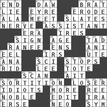 ACROSS 1. Conclusion 4. Simpleton 7. Naughty child 11. Untruth 12. Jane of fiction 13. Eat (away) 14. Insect wing 15. Rendezvous 16. Chalkboards 17. Impudent aggressiveness 19. Helper 21. Epoch 23. Angers 24. Public display of a written message 25. Mature 26. Bit 29. The wife of a rajah (variant) 30. Followers of ems 31. Black tropical American cuckoo 32. Snakelike fish 33. Big collection agency 34. Shoshoni 35. Santa ___, CA 36. _-fi 37. Obstructs or blocks passage 40. To free from 41. Area sheltered from the wind 42. Carry 43. Examine hastily 45. Small island 46. Determination 51. Failure 55. Foolish or stupid persons 56. Greater amount 58. Portuguese money of account (variant) 59. Having high moral qualities 60. Prepare for publication 61. Retirement account (abbr.) 62. Celtic language 63. Modern: prefix 64. Symbol (abbr.) DOWN 1. Flair 2. "Death on the ____" 3. Letter starter 4. Color 5. Length times width 6. Soaks 7. Naughty children 8. Roll call or roster of names 9. Arabian gulf 10. Trial 12. Develop 13. Otherwise 16. Titles for men of rank and authority 18. Distinctive style or manner 20. Omens 22. A saturated hydrocarbon 24. Vegetable dish 25. Nest on high 26. Grayish beige 27. Pismires 28. Pass on 29. Painter Guido (1575-1642) 32. Hearing organ 33. Ancient Celtic tribe of eastern Britain 36. Narrow boards 37. R.R. building 38. Rest room 39. "Beetle Bailey" pooch 43. Fur scarf 44. Quote 46. Trig term 47. Aroma 48. Chest bones 49. Presage 50. Connecting point 52. Indian titles of respect 53. Suggestive of the supernatural 54. 480, 500 or 516 sheets of paper 57. _ de Janeiro