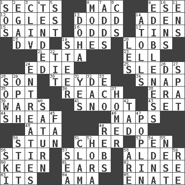 ACROSS 1. Religious groups 6. Big _ 9. Compass dir. 12. Stares 13. Texas town _ City 14. An important port of Yemen 15. Virtuous person 16. Likelihood 17. Metal containers 18. Movie disc 19. "______ My Girl" (Turtles hit) 20. Tennis shots 21. Singer James 23. Pipe bend 24. Singer Brickell 25. Bobsleighs 28. Male offspring 30. Miss Universe 1986, Barbara Palacios _ 34. Fastener 35. Elect 36. Arrive at 38. Epoch 39. Armed conflicts 41. Snout, nose 43. Put into a specified state 44. To gather and bind into a bundle 46. Atlas contents 48. _ moment's notice (2 wds.) 49. Make new 50. Astound 51. "Mermaids" star 53. Writing instrument 56. Disorderly outburst 57. Oscar Madison type 58. Tree or shrub in the Birch family 60. Peachy ____! 61. Hearing organs 62. Wash lightly 63. It is 64. Wet nurse (var.) 65. Related on the mother's side DOWN 1. Distress signal 2. Mild oath 3. 154 in Roman numerals 4. Looked after 5. Fast jet (abbr.) 6. Method 7. Sums up 8. Music discs 9. The property of being fit to eat 10. Elected reps. 11. Followers of ems 13. Capital of the state of Qatar 14. Ringlike coral islands and reefs 19. Navigate 20. French article 22. Teat (slang) 24. Pleas 26. Have the gumption 27. Argument over a trivial matter 28. Sty mamas 29. Brightly colored fish 31. Consenting reply 32. Daniel's nick name 33. Environmental prefix 37. Home run 40. Titan orbits this 42. Small boy 45. Air blower 47. Cotton for raincoats, e.g. 49. Confederate soldiers (slang) 50. Proofreading order 51. Dollar (slang) 52. Israeli folk dance 54. Pulitzer Prize-winning author Ferber 55. A home for chicks 56. What Jean-Claude Killy likes to do 57. Ocean 58. "We ___ not amused" (Victoria) 59. Portuguese money of account (variant)