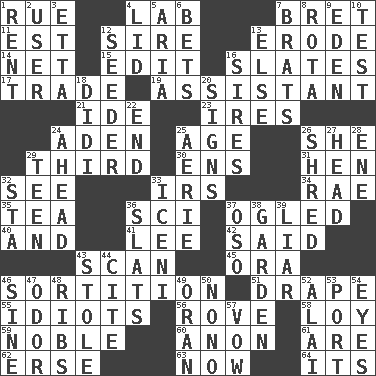 ACROSS 1. Sorrow 4. Experiment locale 7. Cy Young winner Saberhagen 11. Eastern Standard Time (abbr.) 12. Father 13. Wear away 14. Remaining after all deductions 15. Prepare for publication 16. Chalkboards 17. Exchange 19. Aide 21. Binary compound 23. Angers 24. Arabian gulf 25. Ripen 26. A female animal or person 29. One of three equal parts 30. Followers of ems 31. Layer 32. Observe 33. Big collection agency 34. Actress Charlotte 35. Beverage made from leaves 36. _-fi 37. Stared at amorously 40. Also 41. Area sheltered from the wind 42. Stated 43. Skim 45. Mouth or opening 46. Conclusion 51. Window treatment 55. Foolish or stupid persons 56. Be footloose 58. Myrna of the movies 59. Impressive in appearance 60. At once, immediately (arch.) 61. "We ___ not amused" (Victoria) 62. Celtic language 63. At this time 64. ___ a Wonderful Life DOWN 1. Monthly bill 2. One who uses or employs something 3. Singer James 4. Hat (slang) 5. Roberta Peters solo 6. Antes 7. Naughty children 8. Roll call or roster of names 9. Genesis locale 10. Trial 12. Sowing specialist 13. Otherwise 16. Begets 18. "You Light Up My Life" star Conn 20. Signals 22. Conclusion 24. Toward the future 25. Nest on high 26. Fragment 27. Froth on beer 28. Compass dir. 29. Adolescent 32. R.R. building 33. Ancient Celtic tribe of eastern Britain 36. Narrow boards 37. Bear (Spanish) 38. Place where plants grow 39. One who doesn't tell the truth 43. Fur scarf 44. Quote 46. Trig term 47. Aroma 48. Teases 49. Northwest Algerian city 50. Words to Nanette 52. Jai _ 53. Left side of a ship or aircraft 54. Sight organs 57. Solemn pledge