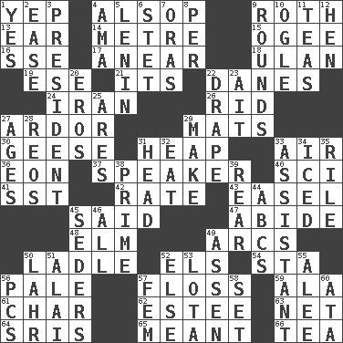 ACROSS 1. Slangy assent 4. Columnist Joseph or Stewart 9. Writer of Portnoy's Complaint (1969) 13. Ewer handle 14. Distance measurement (Brit.) 15. Double curve, resembling the letter S 16. Compass dir. 17. Approach 18. Uhlan (variant) 19. Compass dir. 21. ___ a Wonderful Life 22. Natives or inhabitants of Denmark 24. SW Asia republic 26. To free from 27. Zeal 29. Floor protectors 30. Honkers 31. Pile 33. Atmosphere 36. A really long time 37. Orator 40. _-fi 41. Fast jet (abbr.) 42. Pace 43. Artist's stand 45. Alleged 47. Tolerate 48. Shade tree 49. Curves 50. Dipping utensil 52. Raised railways 54. R.R. building 56. Light colored 57. Soft thread for cleaning between teeth 59. Insect wing 61. Burn to charcoal 62. First name in cosmetics 63. Remaining after all deductions 64. Indian titles of respect 65. Intended 66. Beverage made from leaves DOWN 1. Affirmative reply 2. Relaxation 3. Elected leader of a country 4. Housemaid (var.) 5. Soviet premier 1918-24 6. Proofreading order 7. Mouths or openings 8. For each 9. Periods in a boxing match 10. Stare at amorously 11. Afternoon social gatherings 12. Layer 20. Greek god of love 22. Window treatment 23. Small island 25. Ancient Greek god of war 27. Eras 28. Vintage cars 29. Create 31. Froth on beer 32. Ingest 33. Aide 34. On the rocks 35. Cause heat under the collar 38. First class 39. Tail end 44. Lettered men learn these first 45. Spring feasts 46. 100% 49. NE Netherlands city 50. Cowardly lion portrayer 51. Jai ____ 52. Otherwise 53. Globular water bottle used in Asia 55. Toward shelter 56. Personal Computers (abbr.) 57. Opposite of masc. 58. Put into a specified state 60. "One Day ___ Time"