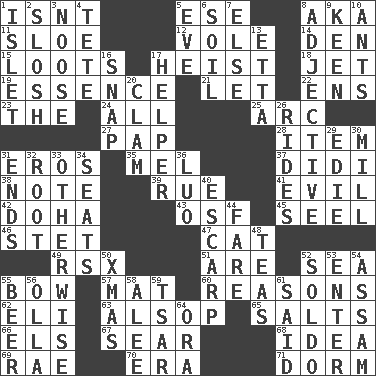 ACROSS 1. Is not 5. Compass dir. 8. Alias (abbr.) 11. _ gin 12. Grand slam 14. Lair 15. Plunders 17. Robbery 18. Passenger plane 19. Gist 21. Allow 22. Followers of ems 23. Definite Article 24. 100% 25. Curve 27. Infant food 28. A whole individual unit 31. Greek god of love 35. Cartoonist voice _ Blanc 37. "You Light Up My Life" star Conn 38. Observe 39. Sorrow 41. Tending to cause great harm 42. Capital of the state of Qatar 43. Order of Saint Francis (abbr.) 45. Stitch closed the eyes of (a falcon) 46. Proofreading order 47. Feline 49. Acura sports coupe 51. "We ___ not amused" (Victoria) 52. Ocean 55. Ribbon knot 57. Floor covering 60. Thinks logically 62. Biblical high priest 63. Columnist Joseph or Stewart 65. Table seasonings 66. Raised railways 67. Shrivel 68. The content of cognition 69. Actress Charlotte 70. Epoch 71. Dormintory (informal) DOWN 1. Small island 2. Agitate, as a liquid 3. Trap for birds or small mammals 4. False hair 5. Night before a holiday 6. Earth 7. Otherwise 8. Descriptive word 9. Peachy ____! 10. Pismires 13. Singer James 16. Fastener 17. Aide 20. Burrowing marine mollusk 26. Amusement-park features 29. Singer Brickell 30. Place where flour is made 31. Conclusions 32. Carrot, for example 33. Else 34. Theater features 36. Nilotic language 40. Fortification 44. Conductor's collection 48. Beverages made from leaves 50. Dec. holiday 52. Twentieth part of a lira 53. Keyboard key 54. Indian state 55. Fermented drink made from hops 56. Spanish pot 58. Toward shelter 59. Russian ruler of old 61. Stated 64. Mouth or opening