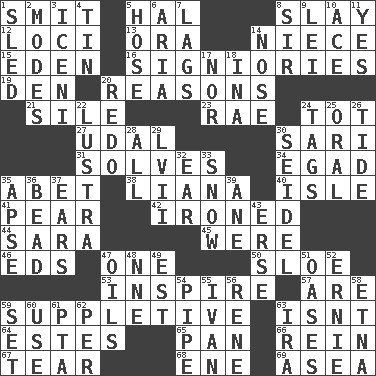 ACROSS 1. Stricken, poetically 5. Actor Linden 8. Kill 12. Event scenes 13. Mouth or opening 14. Sibling's daughter 15. Locale of original sin 16. Seigniories (variant) 19. Lair 20. Thinks logically 21. Drop; flow; fall 23. Actress Charlotte 24. Small child 27. Freehold land 30. Indian skirt 31. Finds the solution 34. Mild oath 35. Collude with 38. Woody, climbing, usually tropical plant 40. Small island 41. Lightbulb-shaped fruit 42. Pressed 44. "Two Mules for Sister ____" 45. We are 46. Begley and Asner 47. Single 50. _ gin 53. Heighten or intensify 57. "We ___ not amused" (Victoria) 59. Supplementary 63. Is not 64. _____ Park, CO 65. Baking dish 66. It's straight from the horse's mouth 67. Pull into pieces 68. Compass dir. 69. Toward the sea DOWN 1. Downhill vehicle 2. Methods 3. Ancient Celtic tribe of eastern Britain 4. Shallow baking pan 5. Stockings 6. Roberta Peters solo 7. Straggles 8. Title for a knight 9. Luau accessory 10. Adept person 11. It is so 14. Olfactory organ 17. And not 18. _ tizzy (2 wds.) 20. Make new 22. A period of five years 24. Labels 25. Relating to the mouth 26. Periodic rise and fall of the sea level 28. Everything 29. 57 in ancient Rome 30. A glass for beer 32. Ewer handle 33. Frozen precipitation 35. Domed church section 36. Necklace unit 37. Hearing organs 39. One (Scot) 43. Celtic language 47. Lubricates 48. Compass dir. 49. Eastern Standard Time (abbr.) 51. Fertile tracts in a desert 52. Bert's buddy 54. Corncob 55. "Terrible" tsar 56. French philosopher Descartes 58. Inactive volcano in Sicily 59. Arrange properly for use 60. Purpose 61. Parent Teacher Assoc. 62. For each 63. Lyricist Gershwin