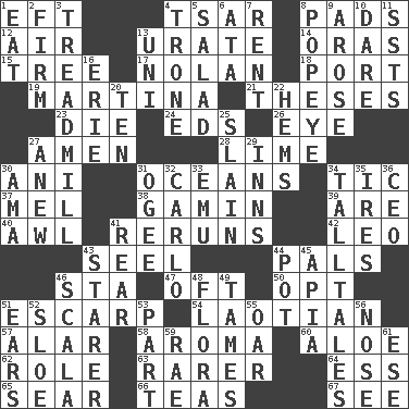 ACROSS 1. Bank Draft (abbr.) 4. Russian ruler of old 8. Groovy apts. 12. Atmosphere 13. A salt of uric acid 14. Mouths or openings 15. Family _ (genealogy) 17. Pitcher Ryan 18. Left side of a ship or aircraft 19. Chrissie's court nemesis 21. College papers 23. Pass on 24. Begley and Asner 26. Sight organ 27. So be it 28. Citrus frut 30. Black tropical American cuckoo 31. Seas 34. Nervous spasm 37. Cartoonist voice _ Blanc 38. Homeless child 39. "We ___ not amused" (Victoria) 40. Leather borer 41. Summer TV shows 42. Lion 43. Sew up the eyelids of hawks and falcons 44. Friends 46. R.R. building 47. Often (poetically) 50. Elect 51. Fortification 54. Of or relating to Laos or its people 57. Having or resembling wings 58. Odor 60. _ vera 62. Hero or heavy, e.g. 63. More uncommon 64. Curvy letter 65. Dry up 66. Beverages made from leaves 67. Perceive with the eye DOWN 1. Consume 2. Securely fixed in place 3. Excercise machine 4. Marketplace scale 5. First course 6. "One Day ___ Time" 7. Monthly bill 8. Wimpy's pal 9. Came up 10. Have the gumption 11. Fast planes 13. University (slang) 16. One of the Great Lakes 20. "___ Little Indians" 22. Cloth borders 25. Killed 27. Afresh 29. Restaurants 30. Wet nurse (var.) 31. Double curve, resembling the letter S 32. Monte _, Las Vegas Hotel/Casino 33. Australian flightless bird 34. Baron Munchausen's specialties 35. Angers 36. Corporate head (abbr.) 41. Bring up, as a child 43. A viewer who gazes fixedly 44. Cooking vessel 45. Capital of Western Samoa 46. Any of the three canals of the cochlea 48. Plants 49. Makes less strong or intense 51. Hearing organs 52. _ gin 53. Role in a play 55. Boat paddle 56. Olfactory organ 59. Actress Charlotte 61. Compass dir.