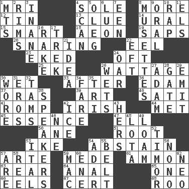 ACROSS 1. Medical imaging device (abbr.) 4. Not divided or shared with others 8. Greater amount 12. Shallow baking pan 13. A slight indication 14. Mountain range 15. Don Adams' spy role 18. A really long time 19. Plant excrements 20. Catching in a trap 22. Snakelike fish 23. Made supply last 24. Often (poetically) 25. Supplement with great effort 26. Electrical Measurement 30. Soggy 33. Following 36. Dutch treat 37. Mouths or openings 39. Tate display 40. Suttee (variant) 41. Play 42. From or relating to Ireland 44. Was introduced to 45. Gist 47. Pipe bend 50. A saturated hydrocarbon 51. Carrot, for example 53. D.D.E's nickname 54. Choose not to consume 57. Johnson of "Laugh-In" 59. Ancient Persian 61. ID or VA city 63. Hitchcock's "____ Window" 64. Of or related to the anus 65. Single 66. Snakelike fish 67. Sure thing 68. Friend of Pooh DOWN 1. Mountains (abbr.) 2. Basketball hoops 3. Silly 4. Examine hastily 5. Cassini of fashion 6. Nilotic language 7. Car or cant ending 8. French bagpipes 9. Taken by mouth 10. Strike 11. Raised railways 16. Immoral or dissolute person 17. Long journey 21. It may be bright or harebrained 22. Lizard (obsolete) 24. Rowing implement 26. Moistens 27. First man 28. Yard entry 29. Send forth 30. Had on 31. Greek god of love 32. Scottish caps 34. Conductor's collection 35. Three (prefix) 38. Orators 42. Frozen water 43. Possessive pronoun 46. Compass dir. 48. Globular water bottle used in Asia 49. Rich soil 52. The easternmost of the Lesser Sundas 53. Slanted text style (abbr.) 54. The sixth month of the Jewish calendar 55. Waist strap 56. Words to Nanette 57. "We ___ not amused" (Victoria) 58. To sift 59. Apple computer (short form) 60. Compass dir. 62. Modern: prefix