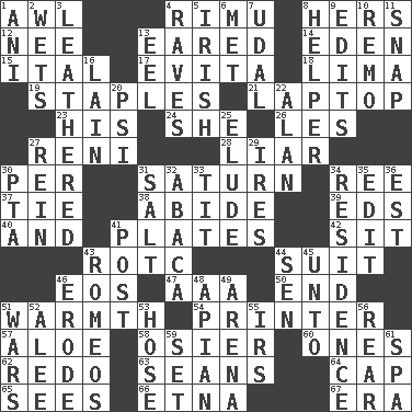 ACROSS 1. Leather borer 4. Tall New Zealand timber tree 8. Possessive pronoun 12. Born 13. Having ears or earlike features 14. Genesis locale 15. Slanted text style (abbr.) 17. Webber/Rice musical 18. Pale green bean 19. Paper fasteners 21. Portable computer 23. Part of HMS, perhaps 24. A female animal or person 26. French article 27. Painter Guido (1575-1642) 28. One who doesn't tell the truth 30. For each 31. Titan orbits this 34. Portuguese money of account (variant) 37. Standoff 38. Remain 39. Begley and Asner 40. Also 41. Food holders 42. Be seated 43. College mil. group 44. Costume for a special activity 46. Greek goddess of the dawn 47. American Automobile Association (abbr.) 50. Conclude 51. Heat 54. Hard copy producer 57. Medicinal plant 58. Flexible twig of a willow tree 60. Singles 62. Do over again 63. Actors Connery and Penn 64. Head covering 65. Observes 66. Inactive volcano in Sicily 67. Epoch DOWN 1. Black tropical American cuckoo 2. Soaks 3. Tough but pliablecoriaceous 4. All-night dance parties 5. From or relating to Ireland 6. Was introduced to 7. Hereditary estate 8. Aide 9. Proofreads 10. San ____ (Riviera town) 11. Fastener 13. Snakelike fish 16. (Had) reclined 20. 23rd letter of the Greek alphabet 22. Actor Alda or Thicke 25. Evade 27. It's straight from the horse's mouth 29. Angers 30. Parent Teacher Association (abbr.) 31. Table seasoning 32. Phillipine bananalike plant 33. Teat (slang) 34. Dwelling 35. Prepare for publication 36. Eastern Standard Time (abbr.) 41. Mail 43. Lover boys 44. Elected rep. 45. To (old English) 46. Eat (away) 48. Bee-related 49. Sports stadium 51. Armed conflicts 52. Toward shelter 53. Stockings 55. Big collection agency 56. Hitchcock's "____ Window" 59. Put into a specified state 61. Health resort