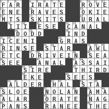 ACROSS 1. At a great distance 4. Feeling or showing extreme anger 9. Be footloose 13. Compass dir. 14. All-night dance parties 15. Migrant worker of the '30s 16. Mountains (abbr.) 17. Burlesque acts 18. Mountain range 19. One more than two 21. Compass dir. 22. Lessep's creation 24. Texas town _ City 26. Working for oneself (abbr.) 27. Ancient Celtic tribe of eastern Britain 29. Pate de foie ____ 30. Remove soap 31. Play the lead 33. Leather borer 36. And so on (abbr.) 37. Popular '50s hangout 40. Ocean 41. Observe 42. Of or related to the anus 43. Slender Brazilian palm 45. Title for a man of rank and authority 47. One of three equal parts 48. Make supply last 49. Observes 50. Tree or shrub in the Birch family 52. Actor Linden 54. R.R. building 56. _ gin 57. Pitcher Ryan 59. Wet nurse (var.) 61. Having or resembling wings 62. Speak pompously 63. Tired old horse 64. Baking dishes 65. Indian princess (variant) 66. Definite Article DOWN 1. Opposite of masc. 2. Against 3. Home 4. Big collection agency 5. Moved through 6. Deliberation 7. Wig 8. Curvy letter 9. Periods in a boxing match 10. Gumbo ingredient 11. Small bottle 12. Snakelike fish 20. Charged atoms 22. High-altitude cloud 23. Santa ___, CA 25. Passed on 27. Angers 28. Quote 29. Highlander 31. Trig term 32. Federal power corp. 33. Helper 34. Put on (as clothing) 35. Put down 38. More uncommon 39. Nathan's nickname 44. "______ My Girl" (Turtles hit) 45. Spring feasts 46. Mamie's husband 49. Chalkboard 50. Silent film actress Nazimova 51. Grant temporary use of 52. Israeli folk dance 53. ____ Jay Lerner 55. Nanny 56. Plant excrement 57. Not either 58. Born 60. Personal question