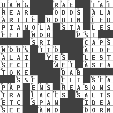 ACROSS 1. Mild oath, euphamism for damn 5. Actress Charlotte 8. Make lace 11. Located in or toward the back 12. Likelihood 14. Chicken ___ king 15. Nick name for Arthur 17. "The Thinker" sculptor 18. Directed 19. Player piano 21. R.R. building 22. French article 23. Snakelike fish 24. Not either 25. Pacific Standard Time (abbr.) 27. _ Lanka 28. Smile enhancers 31. Crowds into 35. It would 37. Medicinal plant 38. Jai ____ 39. Affirmative reply 41. For fear that 42. Religious group 43. Dripping 45. Toward the sea 46. Puff or smoke 47. Small moist lump or mass 49. Compass dir. 51. Biblical high priest 52. Ocean 55. Infant food 57. Followers of ems 60. Thinks logically 62. Lyricist Gershwin 63. Shoestrings 65. Table seasonings 66. And so on (abbr.) 67. Connect, as a bridge 68. The main thing one is thinking about 69. Perceive with the eye 70. Also 71. Dormintory (informal) DOWN 1. Window treatment 2. Nest on high 3. Brizilian seaport 4. Broad smile 5. Friend of Pooh 6. Does sums 7. Prepare for publication 8. Baron Munchausen's specialties 9. Toward shelter 10. Small amounts or degrees 13. Fastener 16. Immeasurably long periods of time 17. Noteworthy scarcity 20. Australian parrot (variant) 26. Any of the three canals of the cochlea 29. Airs 30. Stalk of a moss capsule 31. Vertical spar for supporting sails 32. Margarine 33. Keyboard key 34. Locates 36. Morning condensation 40. Spring feasts 44. Story 48. Prejudice 50. Snakelike fish 52. Twentieth part of a lira 53. Keyboard key 54. Indian state 55. Sliced desserts 56. Johnson of "Laugh-In" 58. California wine valley 59. Examine minutely or intensely 61. Alleged 64. Conclusion