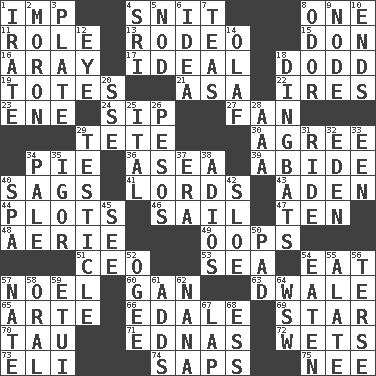 ACROSS 1. Mischievous child 4. In a ____ (agitated or irritated) 8. Single 11. Hero or heavy, e.g. 13. Cowboy competition 15. Spanish title 16. Like ___ of sunshine 17. Perfect 18. Texas town _ City 19. Hauls 21. White ___ sheet 22. Angers 23. Compass dir. 24. Small drink 27. Avid follower 29. False hair 30. Match 34. Sliced dessert 36. Toward the sea 39. Remain 40. Sinks 41. Nobles 43. An important port of Yemen 44. Ground plans 46. Move on water 47. "___ Little Indians" 48. Nest on high 49. I made a mistake 51. Corporate head (abbr.) 53. Ocean 54. Consume 57. Christmas carol 60. Separate the seeds from cotton 63. A sleeping potion; an opiate (poet.) 65. Johnson of "Laugh-In" 66. Peak District village in England 69. Play the lead 70. The 19th letter of the Greek alphabet 71. Ferber et al. 72. Soaks 73. Connecticut Ivy Leaguer 74. Plant excrements 75. Born DOWN 1. Feeling or showing extreme anger 2. Person of subnormal intelligence 3. Food holder 4. _ Lanka 5. Lower and raise head in agreement 6. The content of cognition 7. Afternoon social gatherings 8. Aroma 9. Thickened enlargement 10. Conclusions 12. Sight organ 14. Norwegian king 18. Empty-headed or silly people 20. Compass dir. 25. Slanted text style (abbr.) 26. Mexican monetary units 28. American Automobile Association (abbr.) 29. One of the two male reproductive glands 31. Travel on or in a vehicle 32. Paradise 33. Car or cant ending 34. Diluted with white 35. Russian composer Stravinsky 37. Epoch 38. Goodbye (Sp.) 40. Health resort 42. A type of plum 45. Observe 50. Writing tablet 52. Double curve, resembling the letter S 54. Consumed 55. Having winglike extensions 56. Laconic 57. Nathan's nickname 58. Taken by mouth 59. Needle case 61. Does sums 62. Nanny 64. Compass dir. 67. Pet locale 68. Double-curved letter