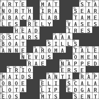 ACROSS 1. Johnson of "Laugh-In" 5. Floor covering 8. R.R. building 11. 0 degrees 13. Lyricist Gershwin 14. Singe 15. Phillipine bananalike plant 16. Experiment locale 17. Not wild 18. French article 19. Trust 21. Flower holders 22. Froth on beer 24. Angers 25. Motion picture awards 27. American Automobile Association (abbr.) 29. Water vessel 30. Beverly of Met fame 32. Queen of England 1702-14 33. Odor 35. Falsehood 39. Congenital growth or mark on the skin 41. Presage 42. Actress Charlotte 43. Slept 45. Musical group of three 48. Celtic language 49. Unmarried girls 50. Against 52. Reproach for some lapse or misdeed 55. Mitch Miller's instrument 56. Connecticut Ivy Leaguer 57. Any of the three canals of the cochlea 59. Globular water bottle used in Asia 60. Mouth edge 61. _ Allan Poe 62. Greek goddess of the dawn 63. Mountains (abbr.) 64. Posted DOWN 1. Of or related to the anus 2. Loose flowing garment 3. File 13 4. And so on (abbr.) 5. Place where flour is made 6. Like ___ of sunshine 7. Bar bill 8. Gospel singer Marvin 9. Corrects by punishment or discipline 10. Ancient Greek god of war 12. Ethiopian city, capital of Harari 14. Play the lead 20. Begley and Asner 21. Small bottle 23. Consumed 25. Chief or king in Benin or Nigeria 26. Manchild 27. Direct toward a target or goal 28. In the manner of 30. Distress signal 31. Closes up, plugs up 33. Actress Gardner 34. Regret 36. Electrical Measurement 37. Area sheltered from the wind 38. Conclusion 40. Greek god of love 43. Remaining after all deductions 44. Ascend 45. Off limits 46. Disturbances 47. The main thing one is thinking about 49. Undercover agent 50. Set down 51. Pinches, bites 53. Actor Alda or Thicke 54. Role in a play 56. Shade tree 58. Music discs