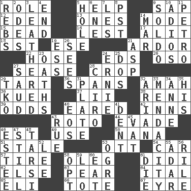 ACROSS 1. Hero or heavy, e.g. 5. Assist 9. Plant excrement 12. Genesis locale 13. Singles 14. Method 15. Necklace unit 16. For fear that 17. Set down 18. Fast jet (abbr.) 19. Compass dir. 21. Zeal 22. Flexible conduit 24. Begley and Asner 26. Bear (Spanish) 27. Gospel singer Marvin 28. Riding implement 29. Small pie 30. Connects, as a bridge 32. Nursemaid 36. Malaysian steamed pastry 37. Cards in a Roman deck? 38. Painter Guido (1575-1642) 39. Likelihood 40. Having ears or earlike features 42. Lodging establishments 43. Printing process, for short 44. Dodge 46. Eastern Standard Time (abbr.) 49. Purpose 50. Nanny 51. Showing deterioration from age 53. Baseball player Mel 54. 4-wheeled motor vehicle 57. Hoop that covers a wheel 58. Cassini of fashion 61. "You Light Up My Life" star Conn 62. Otherwise 63. Lightbulb-shaped fruit 64. Slanted text style (abbr.) 65. Connecticut Ivy Leaguer 66. Carryall 67. Jane of fiction DOWN 1. Confederate soldiers (slang) 2. Lyric poems 3. Tough but pliablecoriaceous 4. Conclude 5. Opening into or through something 6. Compass dir. 7. French article 8. Pacific Standard Time (abbr.) 9. Twentieth part of a lira 10. Goodbye (Sp.) 11. Stone: prefix 14. Spoil 19. Curvy letter 20. Perceives with the eye 21. Viper 23. Expletives 24. Bert's buddy 25. Two (Sp.) 27. Saudi Arabian king (1953-1964) 28. Capital of Egypt 29. Ring climax 31. Food holder 32. Believer in; advocate of (suffix) 33. Ananias' fault 34. Singer Murray 35. Part of HMS, perhaps 40. Greek goddess of the dawn 41. Undesirable depression on a surface 43. Sorrow 45. Large container 46. First name in cosmetics 47. Not moving 48. Tarsus (plural) 52. Area sheltered from the wind 53. Legendary monster 55. The sixth month of the Jewish calendar 56. Cause heat under the collar 58. Elect 59. Lion 60. Erode 61. Expire