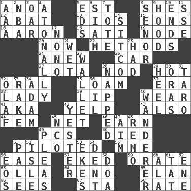 ACROSS 1. Small Philippine buffalo 5. Eastern Standard Time (abbr.) 8. "______ My Girl" (Turtles hit) 12. Blind as ____ 13. "Vaya con ____" 15. Immeasurably long periods of time 16. Composer Copland 18. Suttee (variant) 19. Thickened enlargement 20. At this time 22. Modes 24. Afresh 26. Automobile 27. Globular water bottle used in Asia 28. Allow head to fall sleepily 29. Being at a high temperature 32. Taken by mouth 35. Rich soil 37. Epoch 38. Kenny Rogers chart-topper in '80 39. Mouth edge 40. Put on (as clothing) 41. Alias (abbr.) 42. Sharp bark 43. In addition 44. Opposite of masc. 45. Remaining after all deductions 46. Merit 49. Personal Computers (abbr.) 50. Passed on 51. Manned the helm 55. Madame (abbr.) 56. Comfort 57. Made supply last 59. Speak pompously 63. Rounded earthenware pot or jar 64. Western Nevada city 65. Style 66. Perceives with the eye 67. R.R. building 68. Pace DOWN 1. Auto club (abbr.) 2. Basketball assoc. 3. Boat paddle 4. Without tonality 5. Begley and Asner 6. Thailand, formerly 7. Carryall 8. Sir (Sp.) 9. Parka part 10. Conclusions 11. Compass dir. 14. "Cheers" or "Ellen" 17. Words to Nanette 21. Dripping 23. Possessed 25. Place for singles 28. Slept 29. Person who is morally reprehensible 30. Mouths or openings 31. Edible starchy tuberous root 32. Norwegian king 33. Immoral or dissolute person 34. First of billions? 36. Petroleum 40. Roamer 42. Of or pertaining to yesterday 45. Non-commissioned officer (abbr.) 47. Direct toward a target or goal 48. San ____ (Riviera town) 49. Entreaties 51. Diluted with white 52. Capri or Wight 53. Makes supply last 54. Undesirable depression on a surface 56. Greek goddess of the dawn 58. ___ good deed 60. Insect wing 61. Make lace 62. Compass dir.