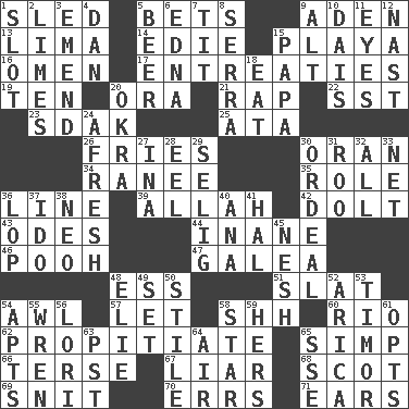 ACROSS 1. Downhill vehicle 5. Wagers 9. Arabian gulf 13. Pale green bean 14. Singer Brickell 15. Beach, in Buenos Aires 16. Sign of something about to happen 17. Pleas 19. Nine, plus one 20. Mouth or opening 21. Hit sharply and swiftly 22. Fast jet (abbr.) 23. Neighbor of Neb. 25. "One Day ___ Time" 26. Strips of potato fried in deep fat 30. NW Algerian seaport 34. The wife of a rajah (variant) 35. Hero or heavy, e.g. 36. Actor's bit 39. Assad's deity 42. Stupid person 43. Lyric poems 44. Silly 46. "Silly old bear" 47. An organ shaped like a helmet 48. Curvy letter 51. Narrow board 54. Leather borer 57. Allow 58. Quiet! 60. River (Sp.) 62. Conciliate 65. Simple or foolish person 66. Laconic 67. One who doesn't tell the truth 68. Highlander 69. In a ____ (agitated or irritated) 70. Blunders 71. Hearing organs DOWN 1. Narrow, elongated depression 2. Citrus fruits 3. Make improvements or corrections to 4. Daniel's nick name 5. Fermented drink made from hops 6. Pulitzer Prize-winning author Ferber 7. Teat (slang) 8. Father Junipero _ 9. The first octave above the treble staff 10. Raised platform 11. Sight organs 12. Political cartoonist Thomas 15. Dad 18. Ingest 20. Gumbo ingredient 24. Anew 27. _ tizzy (2 wds.) 28. Snakelike fish 29. Former Milwaukee Brewers owner Bud 30. Severe or trying experience 31. Friend of Pooh 32. Everything 33. Fish or hair follower 36. Trim (branches) 37. Wedding promise 38. Modern: prefix 40. Santa ___, CA 41. Actor Linden 45. Delicate 48. Writer Wiesel 49. Arrange properly for use 50. Vertical member of a panel or frame 52. N. Chile seaport 53. Southeast Indonesia island 54. Flats, for short 55. Songbird 56. Australian parrot (variant) 58. Play the lead 59. Possessive pronoun 61. Chooses 63. Pacific Standard Time (abbr.) 64. Atmosphere 65. Compass dir.