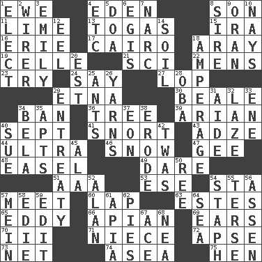 ACROSS 1. She-sheep 4. Locale of original sin 8. Manchild 11. Citrus frut 13. Ancient Roman robes 15. Lyricist Gershwin 16. 4th largest of the Great Lakes 17. Capital of Egypt 18. Like ___ of sunshine 19. Cell (Danish) 21. _-fi 22. Not women's 23. Attempt to accomplish something 24. Declare 27. Chop off 29. Inactive volcano in Sicily 30. Calif. Air Force Base 34. Prohibit 36. Woody plant 39. Believer in; advocate of (suffix) 40. Back-to-school mo. 41. Derisive sound 43. Edge tool used to cut and shape wood 44. Extremist 46. Frozen precipitation 47. Turn to the right 48. Artist's stand 49. Have the gumption 51. Auto club (abbr.) 53. Compass dir. 54. R.R. building 57. Rendezvous 60. Pet locale 63. _____ Park, CO 65. Whirlpool 66. Bee-related 69. Hearing organs 70. One more than two 71. Sibling's daughter 72. Domed church section 73. Fish or hair follower 74. Toward the sea 75. Layer DOWN 1. Opt 2. One who wires 3. Poet Dickinson 4. And so on (abbr.) 5. ___ good deed 6. Armor plate that protects the chest 7. Drug cop 8. Beget 9. NW Algerian seaport 10. Negative votes 12. Snakelike fish 14. The visible part of the earth's surface 18. Electrical Measurement 20. Eastern Standard Time (abbr.) 25. Pismires 26. Tall tales 28. Chief or king in Benin or Nigeria 29. Plea 31. Assistant 32. Goldbrick 33. Compass dir. 34. Actor Lugosi 35. Tenement units (abbr.) 37. A really long time 38. Eat (away) 40. Take to court 42. It was, poetically 45. Chicken ___ king 50. Portuguese money of account (variant) 52. ____ Jay Lerner 54. Staphylococcus 55. Laconic 56. NE Netherlands city 57. Chow _ 58. Singer Brickell 59. Prepare for publication 61. Capital of Western Samoa 62. Sliced desserts 64. Ocean 67. Adept person 68. Teachers' org.