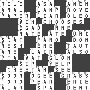 ACROSS 1. Cause heat under the collar 5. White ___ sheet 8. So be it 12. Of or related to the anus 13. Desk light 15. Be footloose 16. Some stationery 18. One who doesn't tell the truth 19. Margarine 20. Zeal 22. Opts 24. Mild oath 26. Compass dir. 27. Nathan's nickname 28. Had dinner 29. Corn or form start 32. Scram, to a cat 35. Papal veil 37. Spanish title 38. Tender 39. Compass dir. 40. Pulled tight 41. One (Scot) 42. Den 43. In addition 44. Parent Teacher Association (abbr.) 45. Large container 46. Seize upon or latch onto something 49. Small drink 50. Sharp bark 51. Leopard's kin 55. Observe 56. Within a short period 57. Double curve, resembling the letter S 59. Seizes 63. "Corrida" creature 64. Lightbulb-shaped fruit 65. 4th largest of the Great Lakes 66. Having or resembling wings 67. Health resort 68. Undesirable depression on a surface DOWN 1. Reproach for some lapse or misdeed 2. _ tizzy (2 wds.) 3. Infant locale 4. Veterans Day date 5. 100% 6. Ketch in the Levant 7. Nanny 8. Came up 9. Undercover agent 10. Nights before holidays 11. Modern: prefix 14. Right away 17. Port city in Latvia 21. Floor covering 23. Single 25. Outscore 28. Disorder of the immune system 29. Allodial 30. Good sense 31. To the inside or interior of 32. Fastener 33. Penny 34. Toward the sea 36. Cuckoo 40. ________ with (broke a safety seal) 42. Portable computer 45. Compete 47. French article 48. Cassini of fashion 49. Sir (Sp.) 51. Calm and collected 52. Israeli folk dance 53. Ripens 54. Pile 56. R.R. building 58. Epoch 60. "We ___ not amused" (Victoria) 61. Storage container 62. Put into a specified state