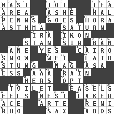 ACROSS 1. Political cartoonist Thomas 5. Small child 8. Afternoon social gathering 11. Length times width 12. American tennis player Robert 14. Actor Linden 15. Actor Sean's family 17. Travels 18. Israeli folk dance 19. Respiratory problem 21. Titan orbits this 23. Retirement account (abbr.) 25. Picture 26. Comedian Laurel of Laurel & Hardy 27. Title for a knight 28. Forbid 31. One (Scot) 33. It is so 35. Capital of Egypt 37. Overwhelm 38. Soggy 40. Put down 41. Feeling sharp psychological pain 43. Tired old horse 45. White ___ sheet 46. Curvy letter 47. American Automobile Association (abbr.) 50. Precipitation 52. Possessive pronoun 53. Choose 54. Bathroom plumbing fixture 56. Artist's stands 61. Snakelike fish 62. Egg locale 65. Member of a famous L.A. basketball team 66. Adept person 67. Johnson of "Laugh-In" 68. Painter Guido (1575-1642) 69. 17th letter of the Greek alphabet 70. Saxophone 71. Sums up DOWN 1. California wine valley 2. Ancient Greek god of war 3. Emitted 4. Hyperbolic tangent 5. Label 6. Bear (Spanish) 7. College paper 8. Son of Odin 9. Merit 10. Chicken ___ king 13. 1973 Nobel Price Winner (Physics) Leo 16. Stricken, poetically 18. Attila the _ 20. Like ___ of sunshine 22. Torque (variant) 24. Afresh 26. Stitched 28. Prejudice 29. Operatic vocal solo 30. Dreamland 31. Pismires 32. Common sense 34. Elected rep. 36. ____ Jay Lerner 37. Compass dir. 39. Pacific island yam 42. Highlander 44. Stare wonderingly 48. Sports stadium 49. Michaelmas daisies 51. Slanted text style (abbr.) 52. Part of HMS, perhaps 54. Technology 55. Butter sub 57. "Two Mules for Sister ____" 58. Supplemented with great effort 59. Grant temporary use of 60. Indian titles of respect 61. Ewer handle 63. R.R. building 64. John Ritter's dad