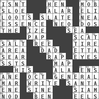 ACROSS 1. Is not 5. Layer 8. Disorderly crowd 11. _ gin 12. Having or resembling wings 14. Biblical high priest 15. Plunders 17. Chalkboard 18. Teachers' org. 19. Center 21. Modern: prefix 22. Two (Sp.) 23. Definite Article 24. Ending with capital 25. Ocean 27. Infant food 28. Scram, to a cat 31. Table seasoning 35. Portuguese money of account (variant) 37. Become fatigued 38. Length times width 39. June honoree 41. Singer James 42. Wither 43. Hit sharply and swiftly 45. Snake ____ (dice throw) 46. Fast planes 47. Atlas unit 49. Part of HMS, perhaps 51. Wing 52. Followers of ems 55. A saturated hydrocarbon 57. Sep. follower 60. Commissioned military rank 62. Third mo. 63. Compose 65. Before Barbara or Clara 66. Compass dir. 67. Trig term 68. Thailand, formerly 69. Dreamland 70. Benjamin's nick name 71. Snakelike fish DOWN 1. Small island 2. Agitate, as a liquid 3. Trap for birds or small mammals 4. False hair 5. Actor Linden 6. Flair 7. Nathan's nickname 8. Ananias' fault 9. Butter sub 10. Prejudice 13. Vintage cars 16. Clip 17. Oozed 20. Russian ruler of old 26. First name in cosmetics 29. Johnson of "Laugh-In" 30. Beverages made from leaves 31. Backtalk 32. Ancient Greek god of war 33. Resembling or made to resemble leather 34. Tarsus (plural) 36. Ewer handle 40. Break 44. Light colored 48. Baking dishes 50. Sty mamas 52. Bert's buddy 53. Relating to or accompanying birth 54. Hits or strikes with great force 55. So be it 56. Billionth: prefix 58. Baby bed with high sides 59. Prong on a fork 61. Comfort 64. Nine, plus one