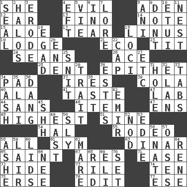ACROSS 1. A female animal or person 4. Morally bad or wrong 8. Arabian gulf 12. Hearing organ 13. Fine (Spanish) 14. Musical sound 15. _ vera 17. Lacerate 18. "_ and Lucy" (Charlie Brown theme song) 19. Cabin 21. Environmental prefix 23. Teat (slang) 24. Seines 26. Adept person 28. Gouge 30. Curse 34. Writing tablet 37. Angers 39. Root beer relative 40. In the manner of 41. Clothes sense 43. Experiment locale 44. Without 46. A distinct part 47. Followers of ems 48. Having the greatest elevation 51. Trig term 54. Actor Linden 55. Cowboy competition 58. Everything 61. Symbol (abbr.) 63. Middle Eastern gold or silver currency 65. Inhabitant of Heaven 67. Ancient Greek god of war 71. Comfort 72. Flintstone garb 73. Cause heat under the collar 74. "___ Little Indians" 75. Celtic language 76. Prepare for publication 77. Compass dir. DOWN 1. Lick closed 2. Radiant circles of light 3. Eat (away) 4. Bank Draft (abbr.) 5. Compete 6. _ tizzy (2 wds.) 7. Old wives' tales, e.g. 8. Black tropical American cuckoo 9. Do not 10. Needle case 11. Egg locale 16. Mild oath 18. Locales 20. Compass dir. 22. Head covering 25. In a ____ (agitated or irritated) 27. And so on (abbr.) 29. Distinguishing feature 30. _____ Park, CO 31. Opening into or through something 32. Enthusiasm 33. Bar bills 34. Romantic infatuation 35. Mountain range southwest of Kyrgyzstan 36. Mild oath, euphamism for damn 38. Eastern Standard Time (abbr.) 42. Independent ruler or chieftain 45. Quiet! 49. Compass direction 50. Mischievous 52. Lower and raise head in agreement 53. Singer Brickell 56. Maternal 57. Fertile tracts in a desert 58. American tennis player Robert 59. Den 60. Hats (slang) 62. Female horse 64. French philosopher Descartes 66. Born 68. To free from 69. Connecticut Ivy Leaguer 70. Arrange properly for use