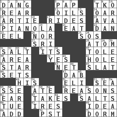 ACROSS 1. Mild oath, euphamism for damn 5. Infant food 8. Ring climax 11. Hitchcock's "____ Window" 12. Petroleums 14. Rowing implement 15. Nick name for Arthur 17. Amusement-park features 18. Actress Gardner 19. Player piano 21. Erode 22. Daniel's nick name 23. Snakelike fish 24. Not either 25. Distress signal 27. Indian title of respect (Mr.) 28. Smallest unit of an element 31. Table seasoning 35. It is 37. Lacquered or enameled metalware 38. Length times width 39. It is so 41. Opening into or through something 42. Play the lead 43. Fish or hair follower 45. Narrow board 46. Arranges properly for use 47. Pat or tap gently 49. Part of HMS, perhaps 51. Biblical high priest 52. Ocean 55. Compass dir. 57. Had dinner 60. Thinks logically 62. Ewer handle 63. Receives possession of 65. Table seasonings 66. Third day of the wk. 67. Angers 68. The main thing one is thinking about 69. Say or write further 70. Pacific Standard Time (abbr.) 71. Dormintory (informal) DOWN 1. Window treatment 2. Nest on high 3. Relating to or accompanying birth 4. Broad smile 5. Luau course 6. Assistant 7. Entreaty 8. Inedible or poisonous agaric 9. Polynesian shrub of the pepper family 10. NW Algerian seaport 13. Fast planes 16. Immeasurably long periods of time 17. Noteworthy scarcity 20. Australian parrot (variant) 26. Curses 29. Rounded earthenware pot or jar 30. Rendezvous 31. Backtalk 32. Johnson of "Laugh-In" 33. Resembling or made to resemble leather 34. Tarsus (plural) 36. Elected rep. 40. Spring feasts 44. Story 48. Prejudice 50. Suttee (variant) 52. Twentieth part of a lira 53. Keyboard key 54. Indian state 55. Stalk of a moss capsule 56. Saudi Arabian king (1953-1964) 58. Canvas cover 59. Makes supply last 61. Alleged 64. Eastern Standard Time (abbr.)